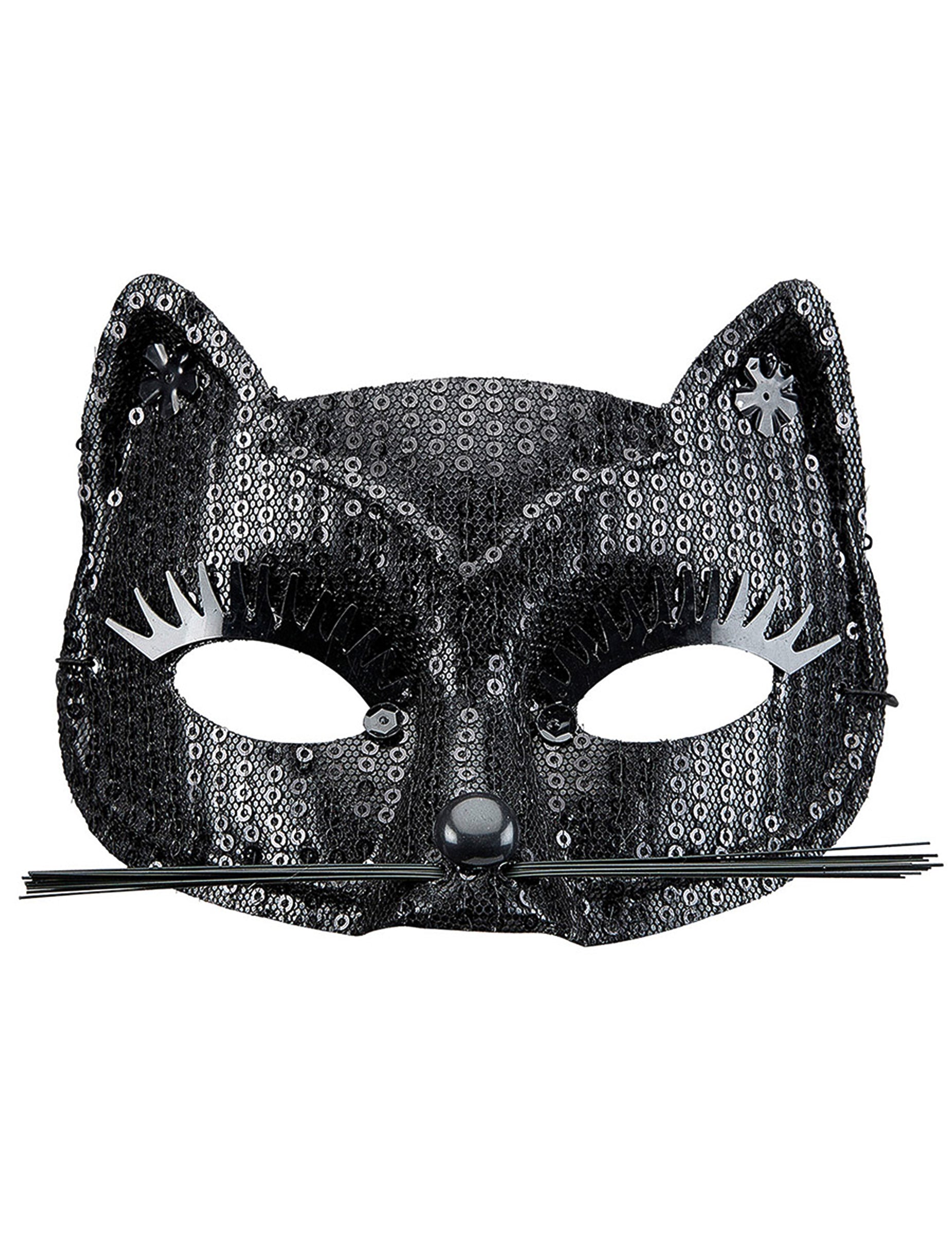 Ez a macska farkas felnőtteknek szóló felnőtteknek szól. Fekete, nagyon finom fekete tüll borítja. A mini fekete flitterek szintén jelen vannak a maszk elején, hogy fényes oldalt kapjanak. A füleket és a szemét hamis szempillák és fekete műanyag virágok kiemelik. A fekete műanyag bajuszok az orr szintjén vannak jelen. Ezt a maszkot rugalmassággal az arcon tartják. Körülbelül 17 cm szélességű. Ez a farkas tökéletes lesz egy fekete csevegés teljes egészében, vagy Catwoman jelmez a karnevál vagy a Halloween számára. Copyright Widmann SRL