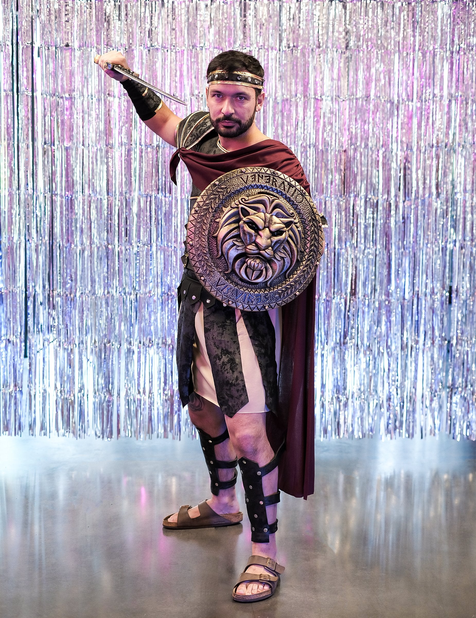 Ez a férfi gladiátor jelmez egy tunikából, páncélból, integrált köpenyből, karszalagokból és mandzsettákból, egy-i-törzsvédőből, vállból és egy medalionból áll. A rövid tunika egyszerű, könnyű, törött fehér színű, és térdre érkezik. A Suede Touch Armor betölti a mellszoborot, és két szalaggal megnyomja a méretet, hogy a hátsó részben bekötjön. Ugyancsak négy vastag rojtok elkerülik és díszítik a tunika alját. A páncélba integrált köpeny bordó piros, hátulba helyezi, és teljesen lefedi a ruhát. A jobb oldalon a váll rögzítve van a karcolásoknak köszönhetően, miközben a bal oldalon a Cape drapériák és borítják a páncél egy részét. A PIN -medalion lehetővé teszi a drapéria vállához való rögzítését. Az arany iratai díszítik az egész álrizót, a kiegészítőket is: a karszalagok és a sípcsontok, amelyek karcolásokkal védik magukat, miközben a mandzsetták csúsznak a csuklón. Végül a fejpántot a homlokára helyezik, és rugalmassággal rögzítik. Csatlakozzon a Caesar soraihoz, és légy a legkarizmatikusabb a spartaiaknak estéidre a rómaiak és a gladiátorok témájáról!