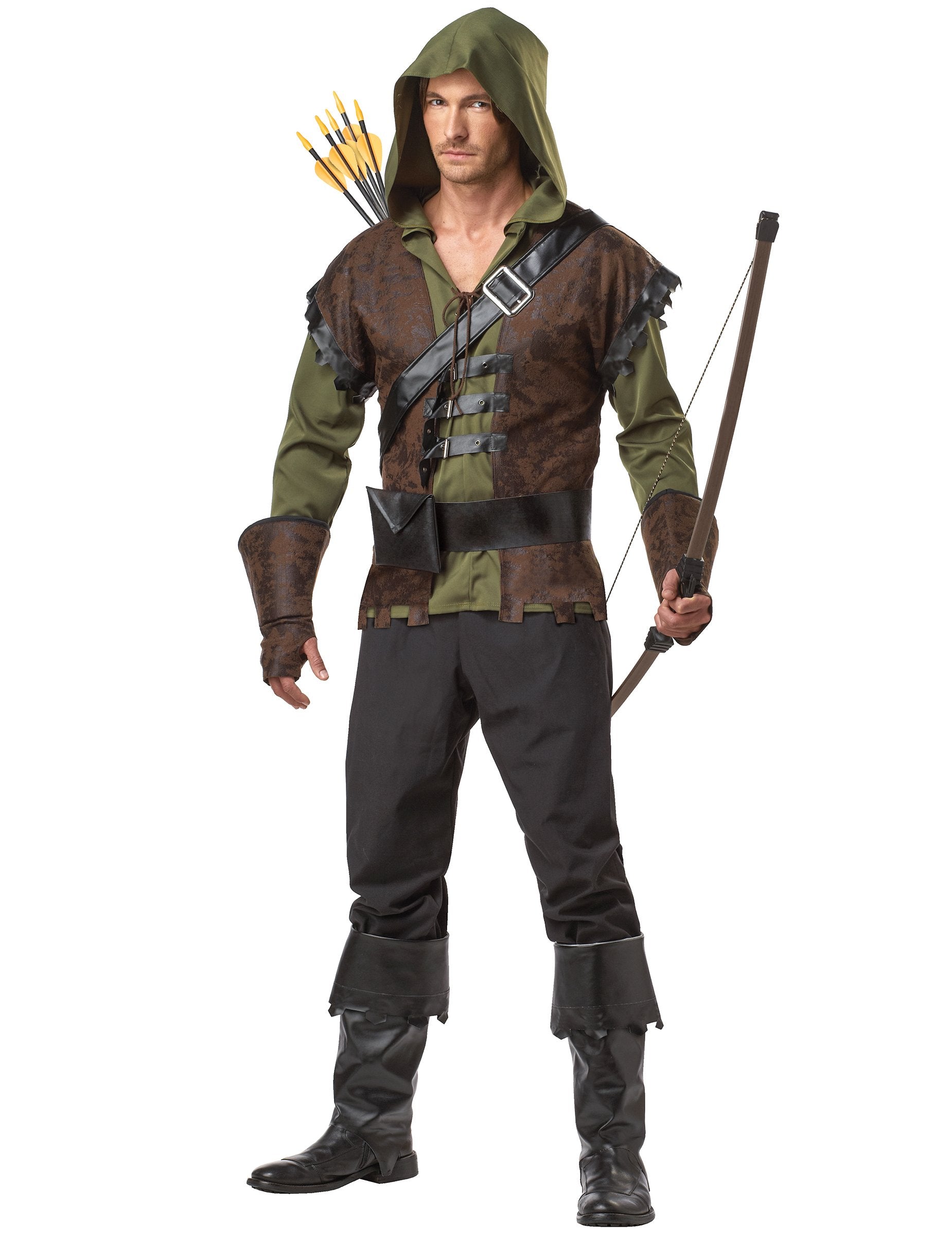 Ez a Robin Wood álruhája a férfiak számára egy felső, övből, kesztyűből és sur-bootsból áll (nadrág és kiegészítők nem tartoznak). A zöld teteje hosszú ujjú. Nagy motorháztetője van, és a törzsnél van. A barna bőr hatékony mellényt közvetlenül ruházattal varrják, és az elülső részén fekete bőrhatások vannak jelen. Elasztikus, tökéletesen alkalmazkodik a morfológiájához. Egy fekete öv ezüst csatgal és egy kis táskával lehetővé teszi a tetejének hullámát. Végül, egy pár kesztyű, amely megfelel a hamis mellénynek, valamint a fekete-sur-boots-nak, hogy az utolsó érintést hozza ennek a ruhának. Ez a jelmez tökéletes lesz, hogy becsúszjon a híres vigilante cipőjébe egy álcázott estére.