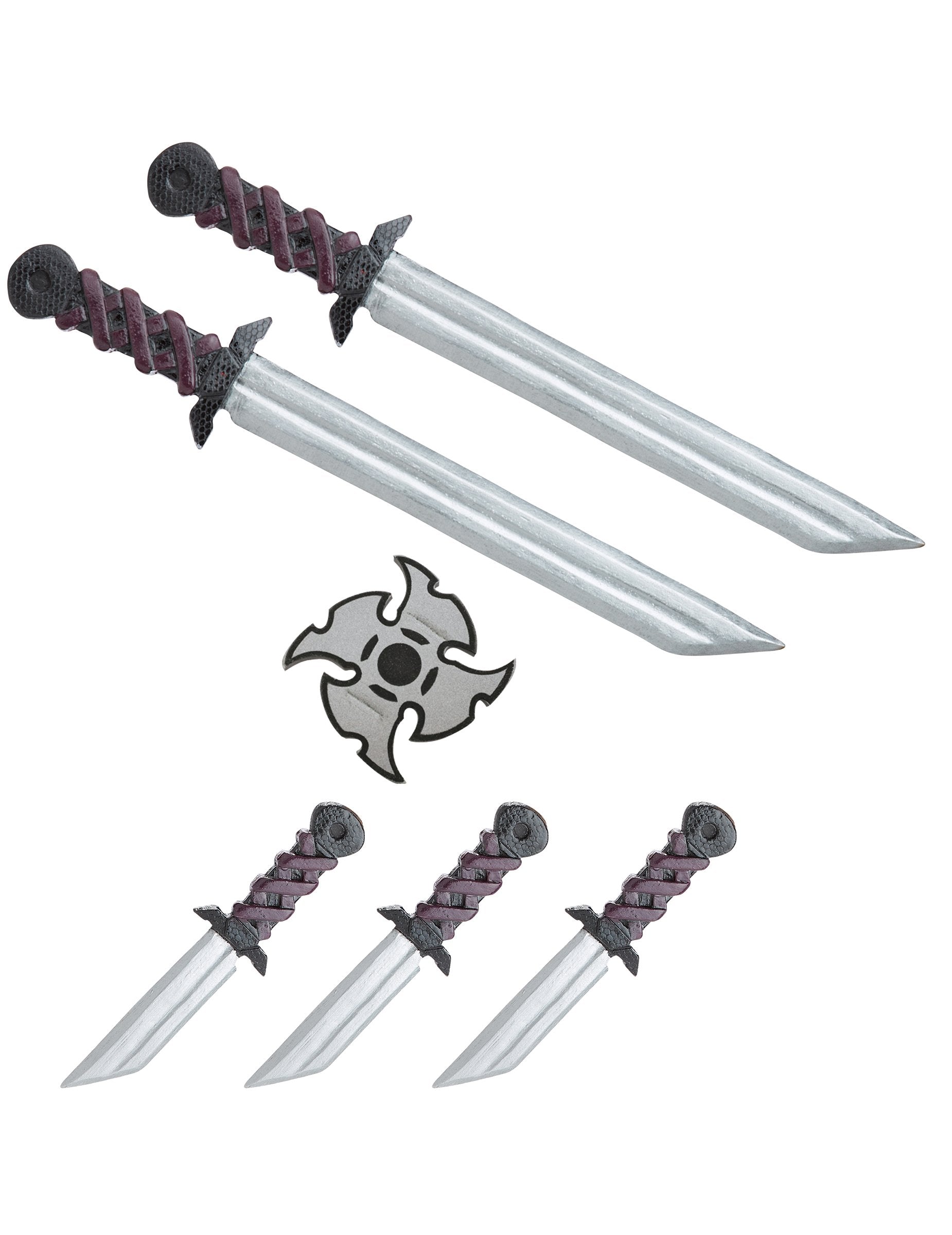 Ez a Ninja fegyverkészlet 3 tőrrel, 2 karddal, egy ninja csillaggal és egy övvel rendelkezik, hogy mindent megköthessen. A műanyag tőröknek és kardoknak ezüst penge van. Fogantyújuk fekete, bordó -színű rácsmintákkal. A műanyag ninja csillag ezüst, fekete központ. Az öv bőrhatás. Ez a Panoply tökéletes ahhoz, hogy az esti nindzsa legyen.