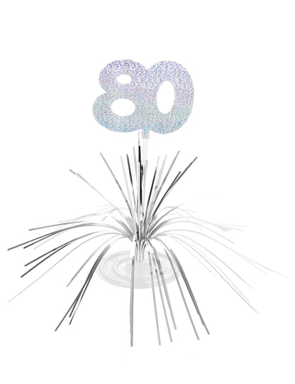 Ez az ezüst asztali központ körülbelül 29 cm magas és 30 cm átmérőjű. Ez egy ezüst huzalokkal rendelkező műanyag alapból áll. A 80 -as szám a táblázat közepén van rögzítve. Ez a kiegészítő tökéletes lesz az asztali dekoráció befejezéséhez egy születésnapi partira.
