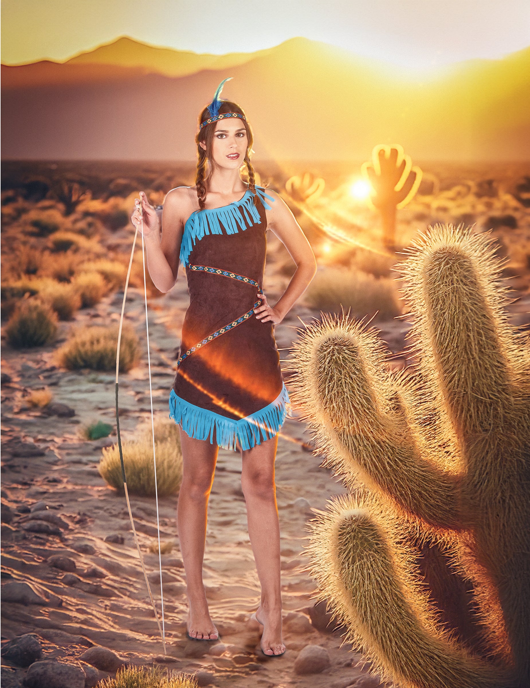 A fejpánt rugalmas és ugyanolyan etnikai mintákat ábrázol, mint a ruha. Egy kék toll díszíti majd a fejed oldalát.
