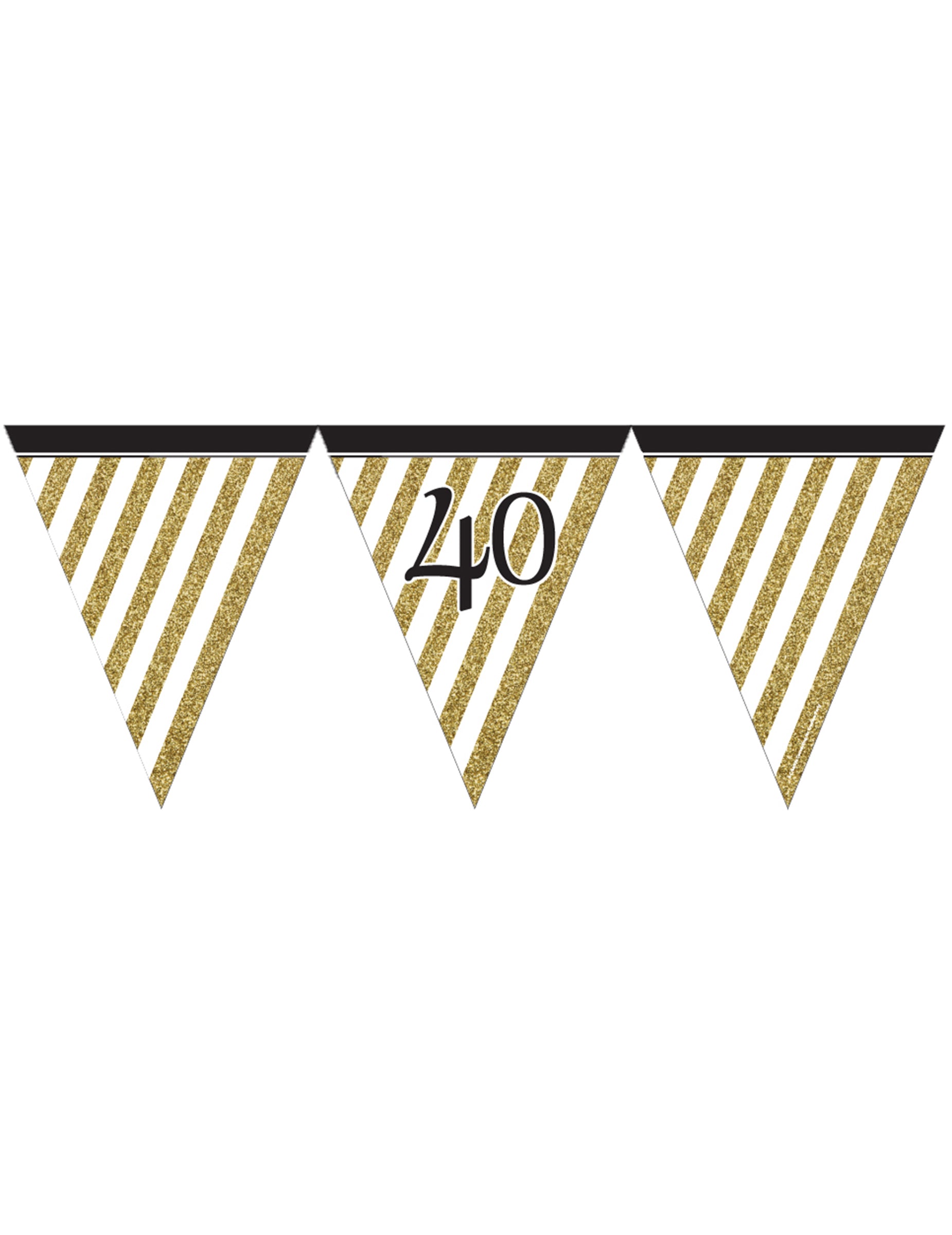 Ez a zászló koszorút hossza 3,7 méter. Ez magában foglalja a 11 x 18 cm méretű 11 papír zászlót. Ezek a zászlók fehérek, aranycsíkokkal csillogó hatással. A "40" figurát fekete színben írják, egy két zászlóra. Ez a Pennant Garland tökéletes lesz egy elegáns születésnapi dekoráció létrehozásához 40. születésnapján!