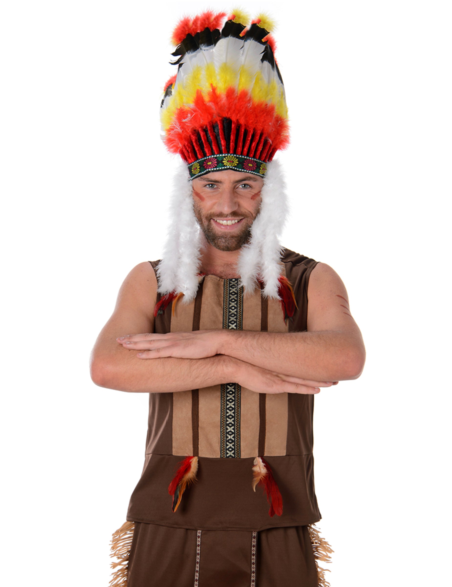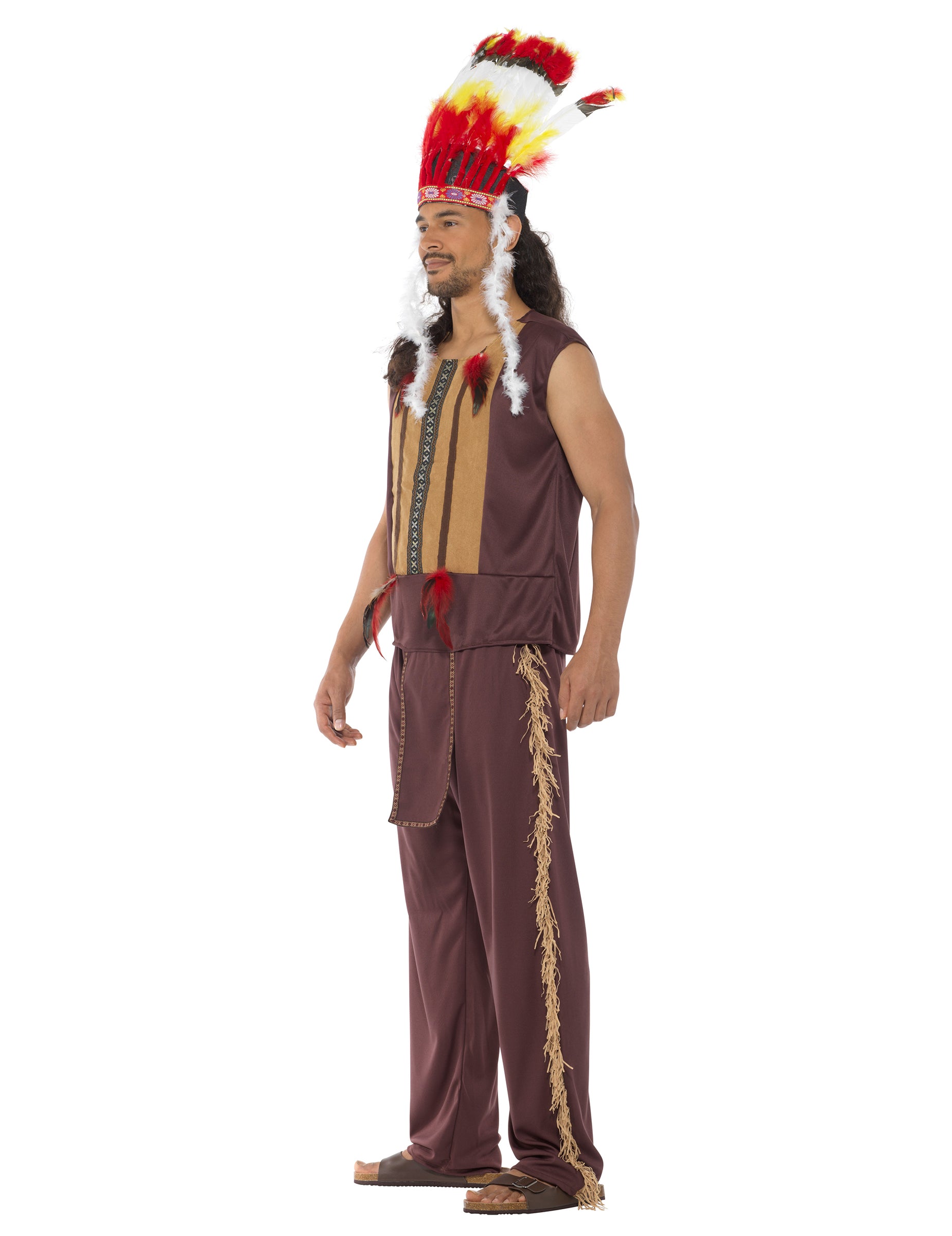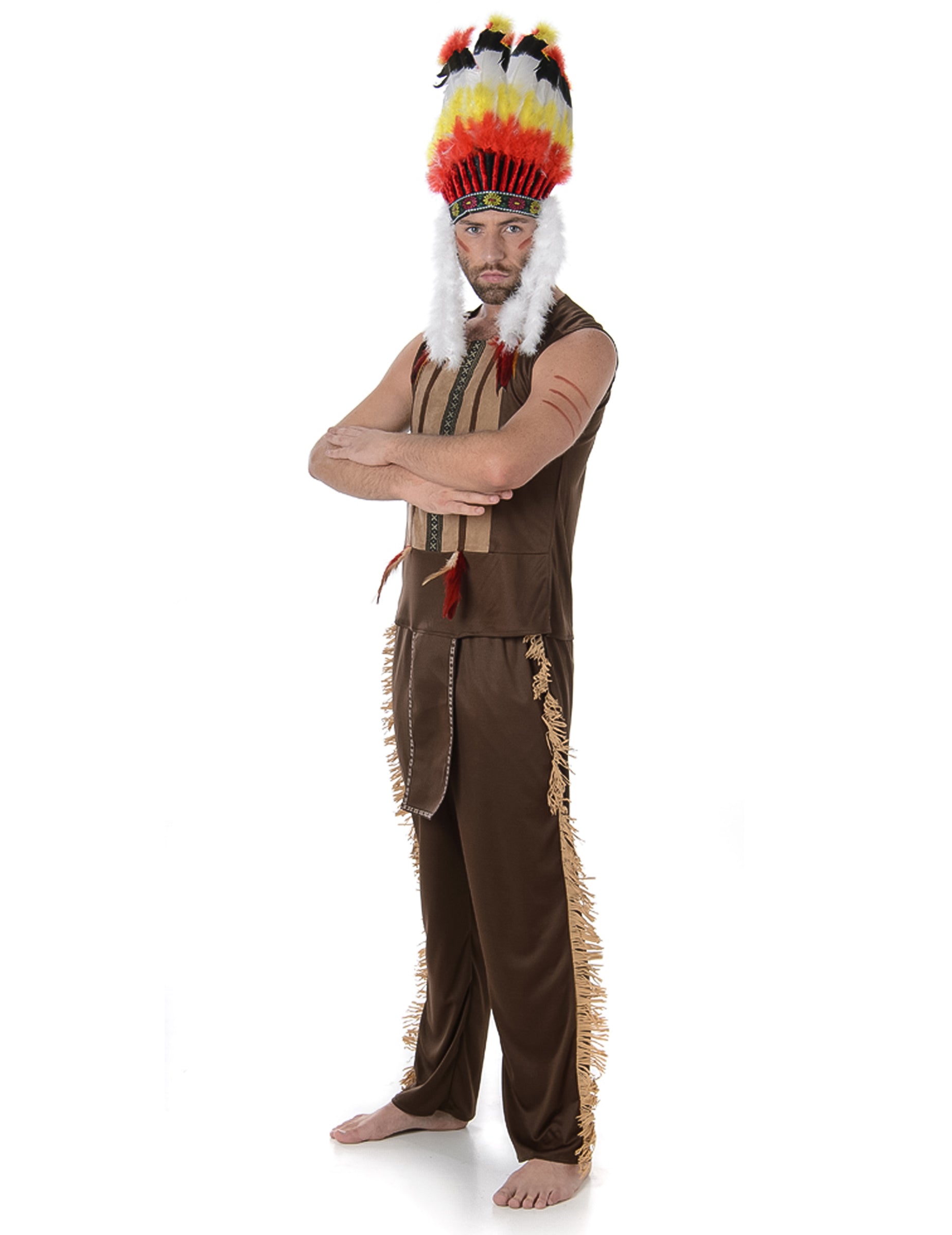 Ennek az indiai főnöknek a férfiaknak szóló jelmeze nadrágból, felső és sapkából áll. A magas szintű teteje sötétbarna, elöl egy világosabb bőrhatású csíkkal. A nyak szintjén néhány tollak díszítik. A barna nadrág derekán rugalmas. Az oldalán kis rojtok díszítik. Végül egy indiai főnök fejdíja befejezi ezt a ruhát. Ezt a sapkát nagy színes toll díszíti, és hátul rugalmas, hogy alkalmazkodjon a fejéhez. Élvezze újra az indiánok idejét a karnevál vagy más ünnepi rendezvény során.