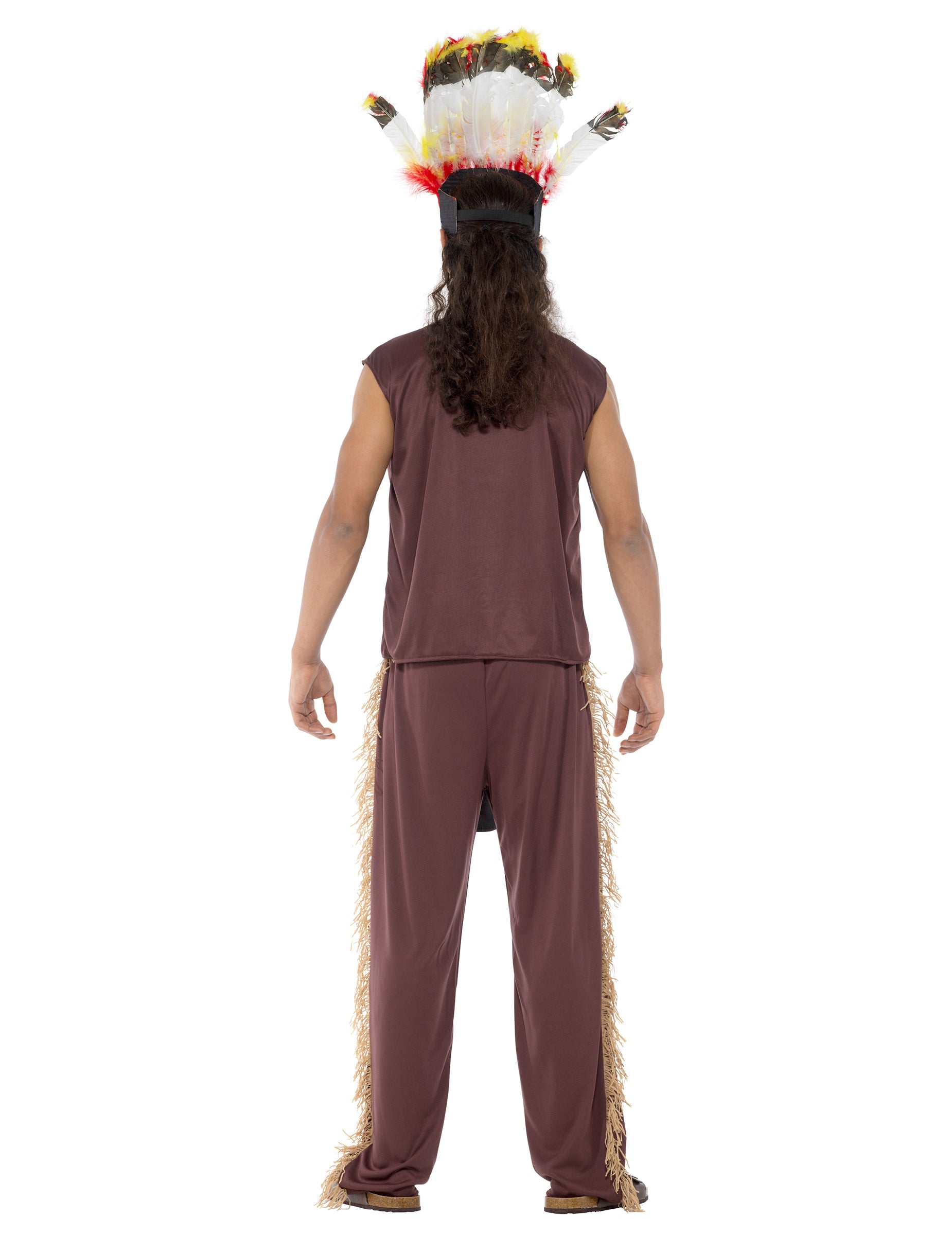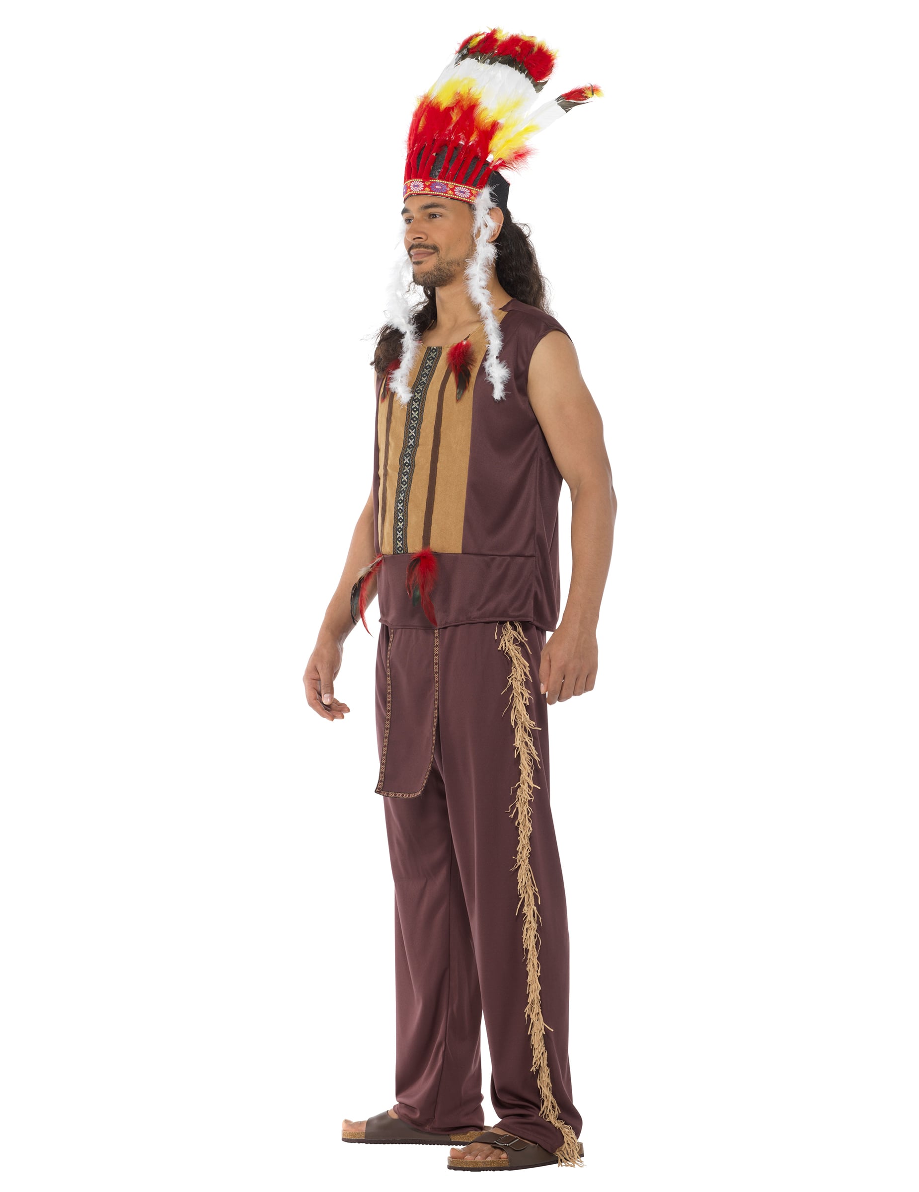 Ez Indiai törzsfőnök jelmez férfiaknak Nadrágból, felsőből és fejdíszből áll. Az ujjatlan felső sötétbarna, elöl világosabb, bőrszerű sávval. A nyakkivágásnál néhány toll díszíti.
