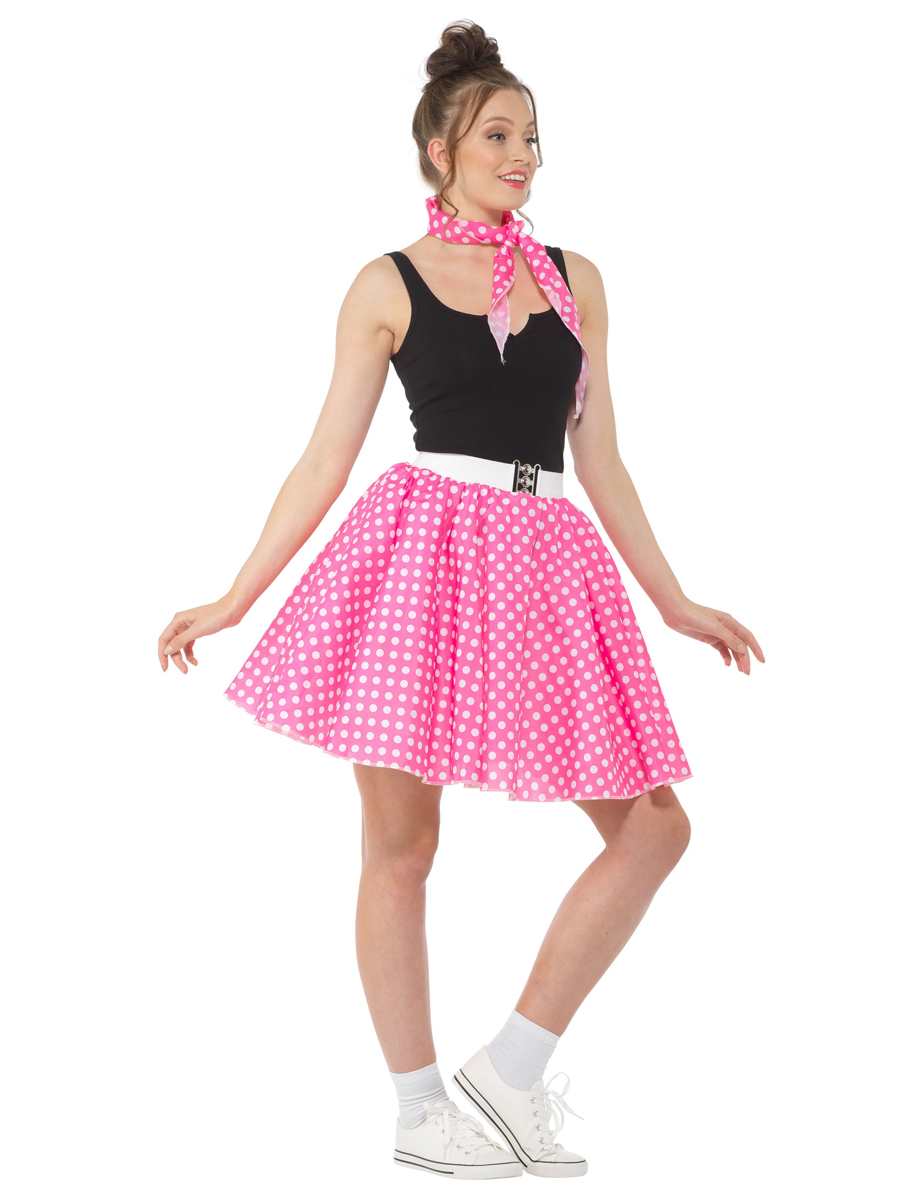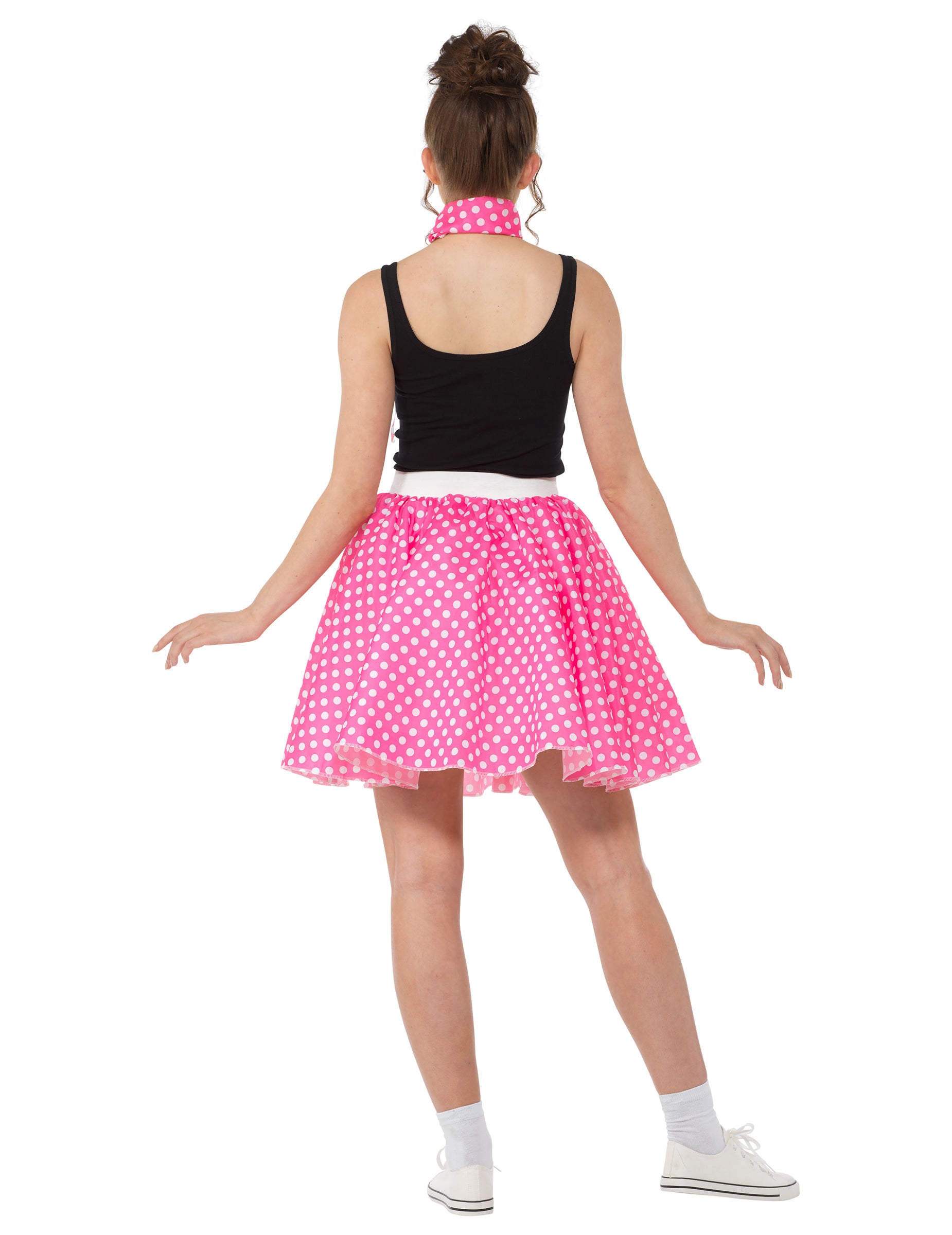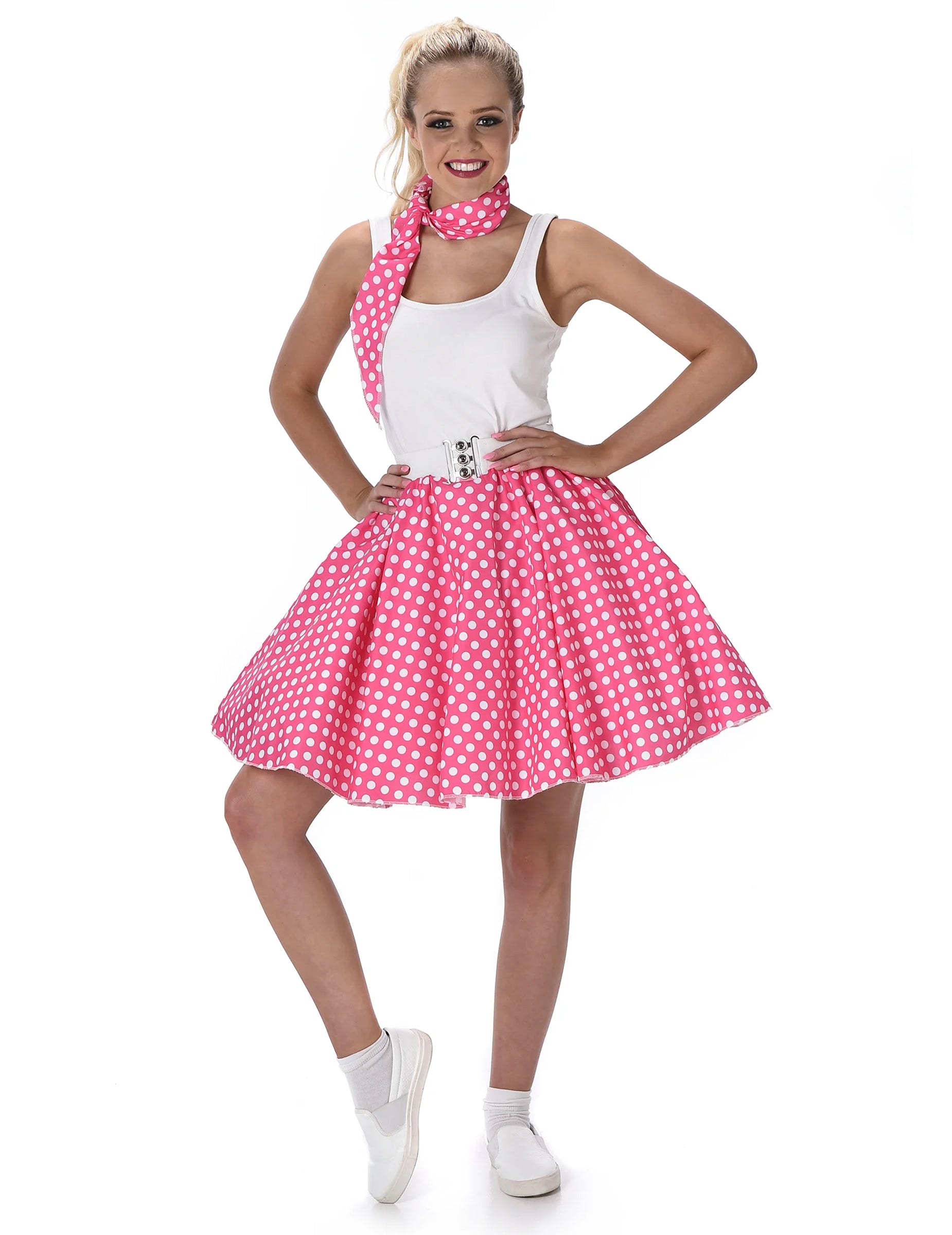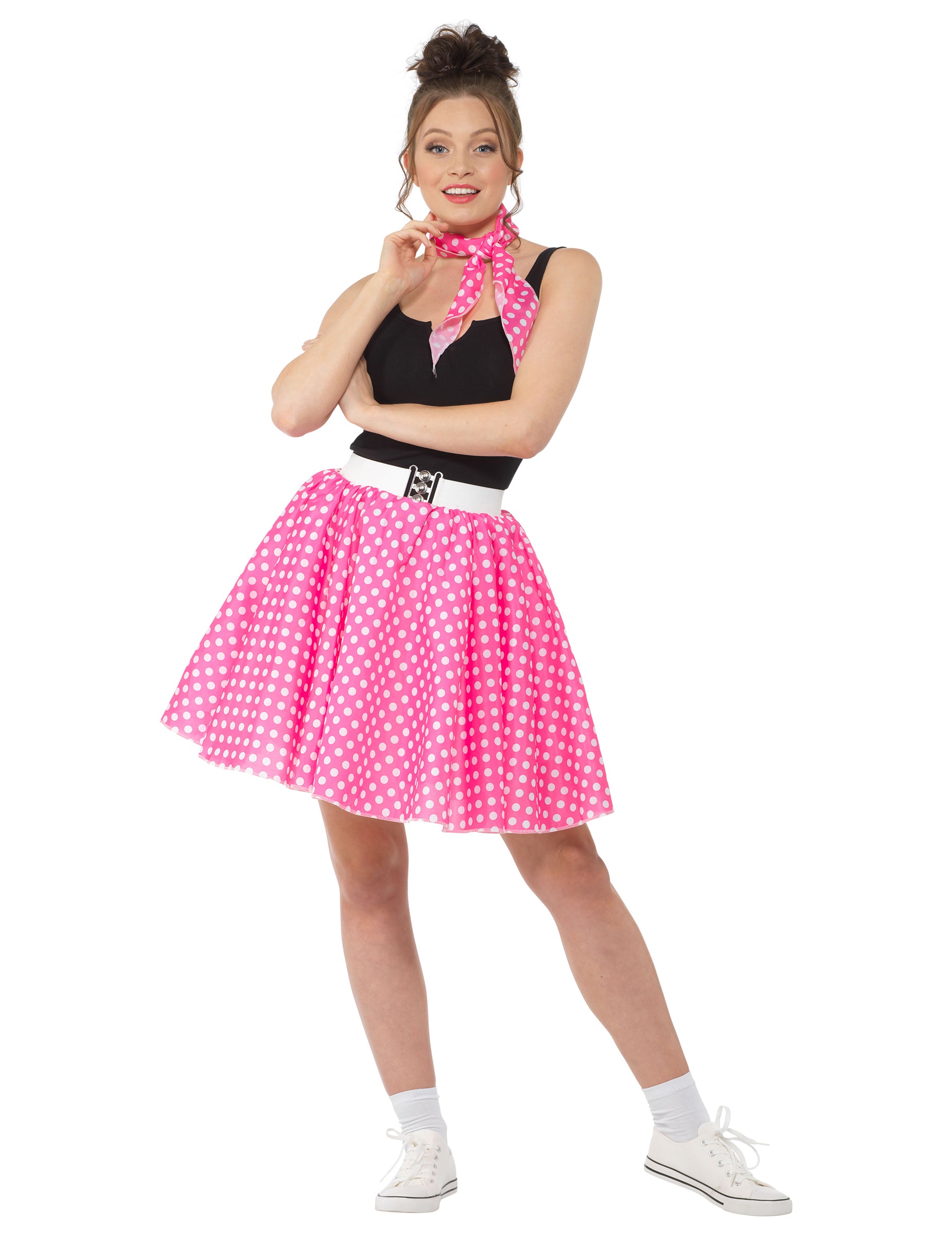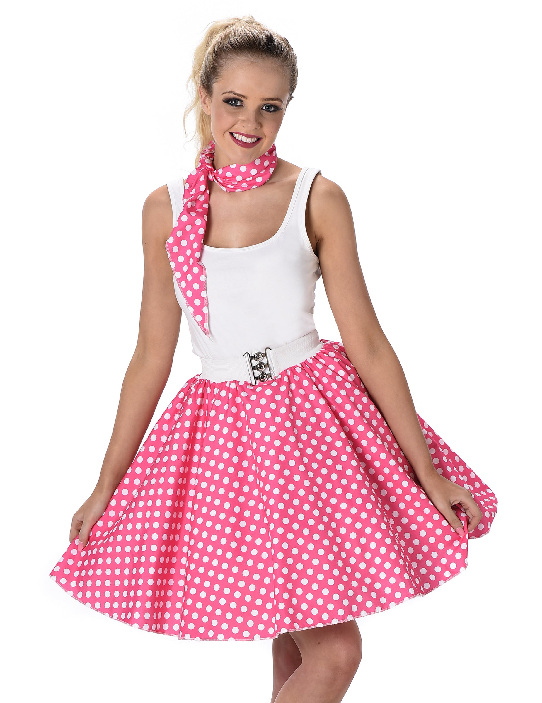 Ez a retro női jelmez egy szoknyából és egy sálból áll. A kiszélesedő szoknya rózsaszín, fehér pöttyökkel. Elasztikus derékpánt közvetlenül a derékra van varrva. Ez az öv elöl horgolt. A sál passzol a szoknya anyagához. Egyszerűen a nyak köré kötődik. Ez a pöttyös készlet tökéletes lesz ahhoz, hogy kiegészítse megjelenését egy 50-es évek témájú partiján.