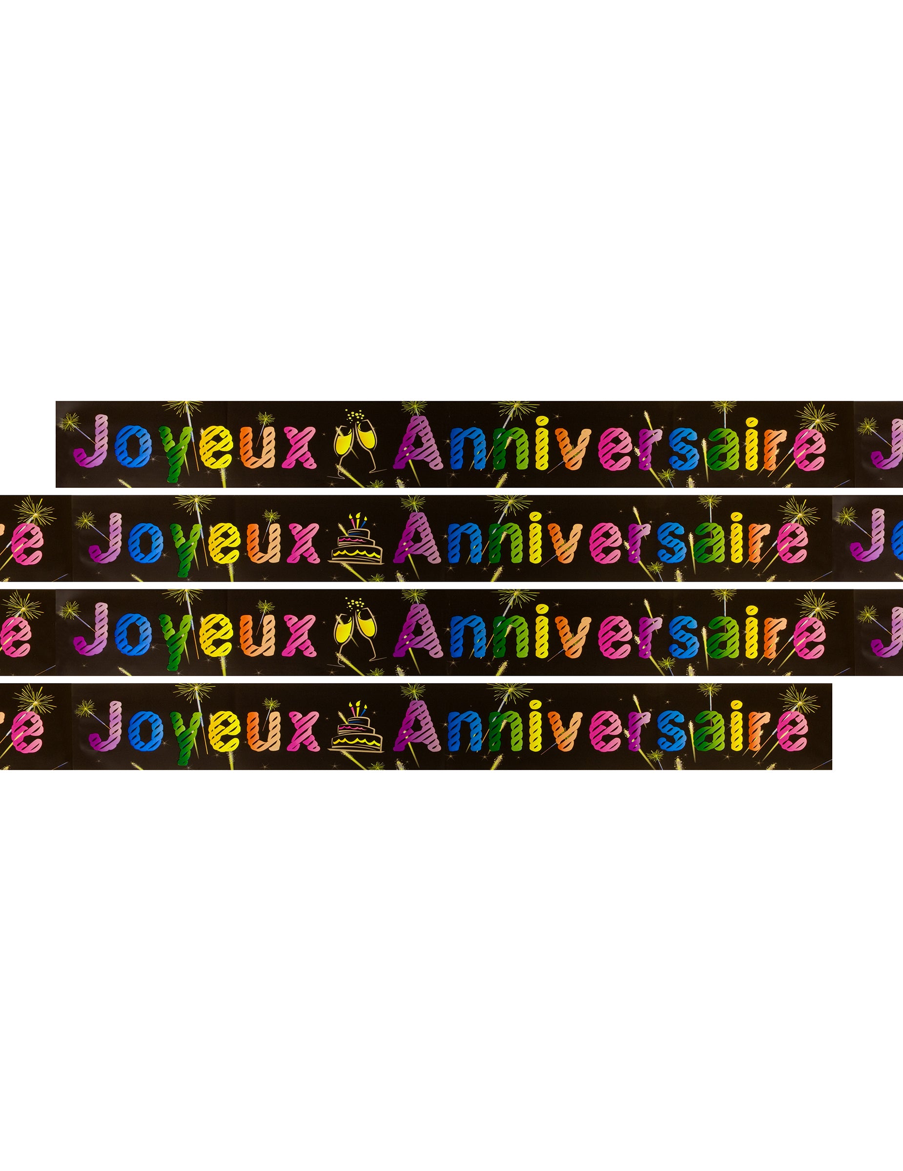 Ez a dekoráció egy alumínium zászló. Fémes fekete színű, 3,60 m hosszú és 12 cm széles. A "Boldog születésnapot" említést többszínű betűkkel nyomtatják a teljes hosszúság alatt. Az olyan ünnepi minták, mint a tűzijáték és a születésnapi sütemények, körülveszik a feliratot. Könnyedén a falon tarthatja a Lo'aide Scotch vagy a Patafix. Ezt a 3,60 m -es szalaghirdetést olyan helyeken is kivághatják, hogy több helyet fedjenek le. Válasszon egy elegáns és színes dekorációt ezzel a fényes dekorációval a sikeres születésnap alkalmával!