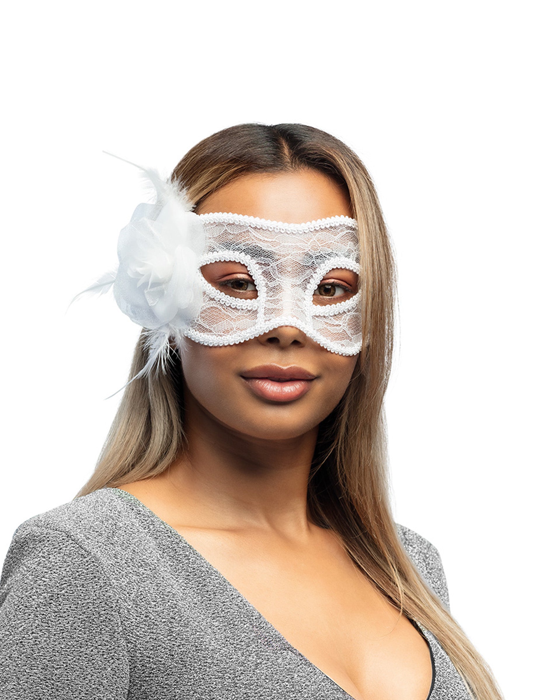 Ez a farkas a nők számára fehér. A csipkehatás szempontjából ez egy virágból áll, enyhítő fehér fátyolban és fehér tollakban. A törött fehér zsinór díszíti a maszk és a szem területét. Ez a farkas kb. 22 cm széles. Fekete rugalmasság van jelen, hogy megkönnyítsék az arcon a maszk karbantartását. Töltse ki a labdaruhát, és elcsábítsa az angyal megjelenésével.