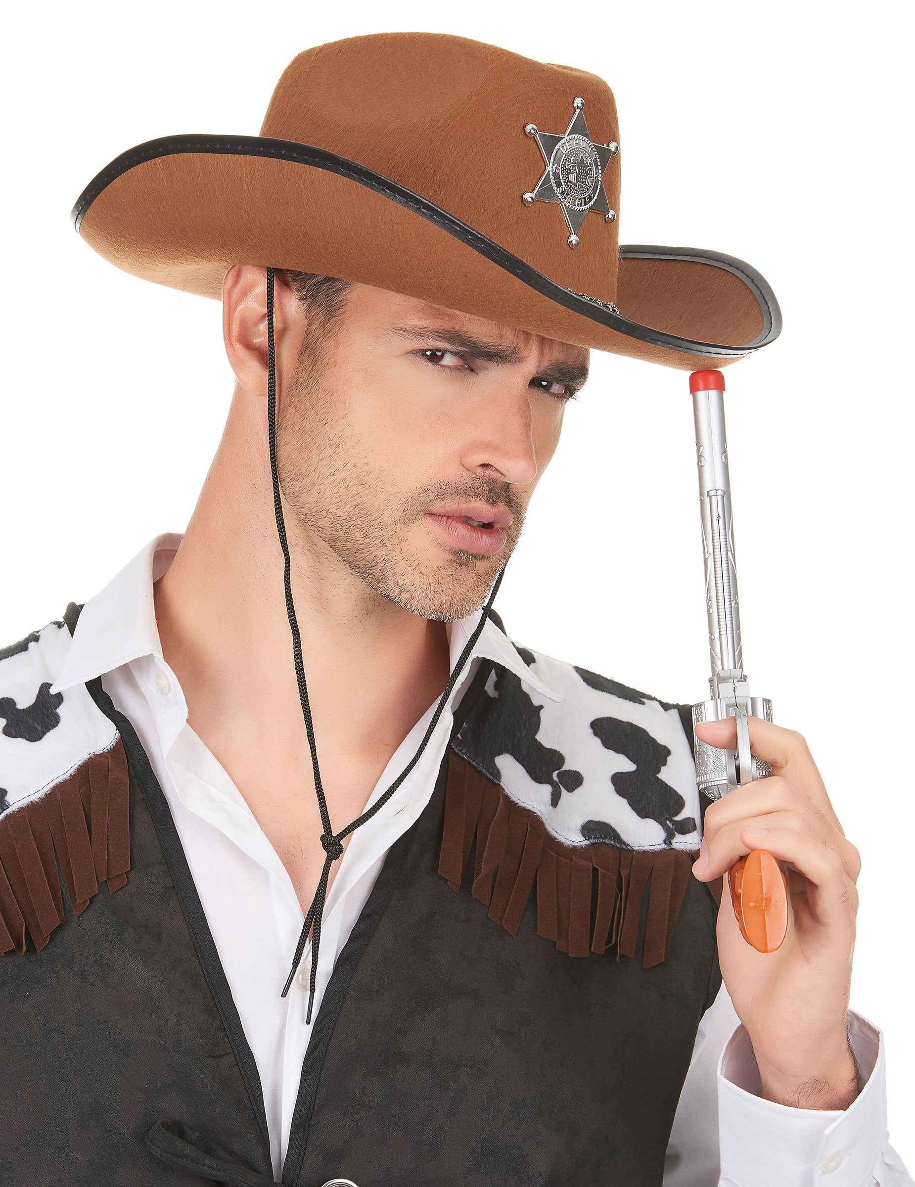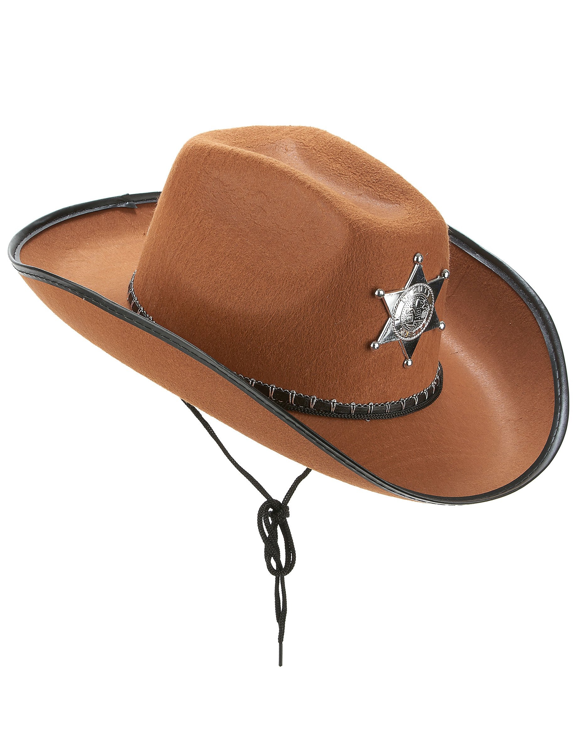 Ez a kalap cowboy erre való felnőttSzínezett barna és szempontból merev, A ezüst seriff jelvény elölre van ragasztva. A fej kerülete 59 cm hozzávetőlegesen.