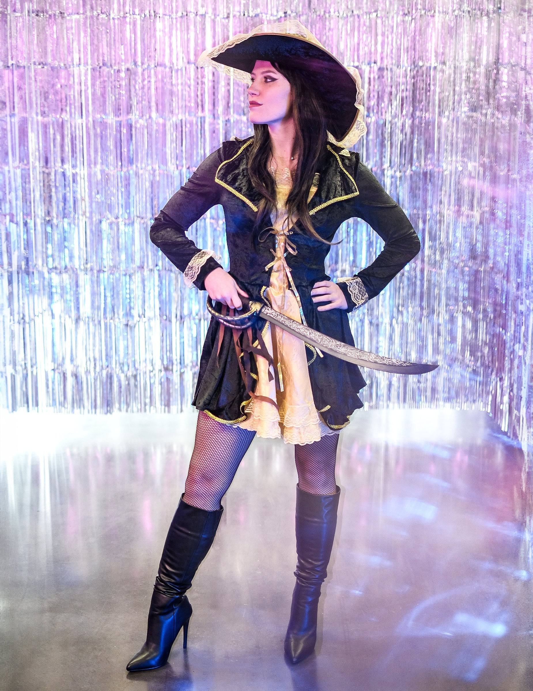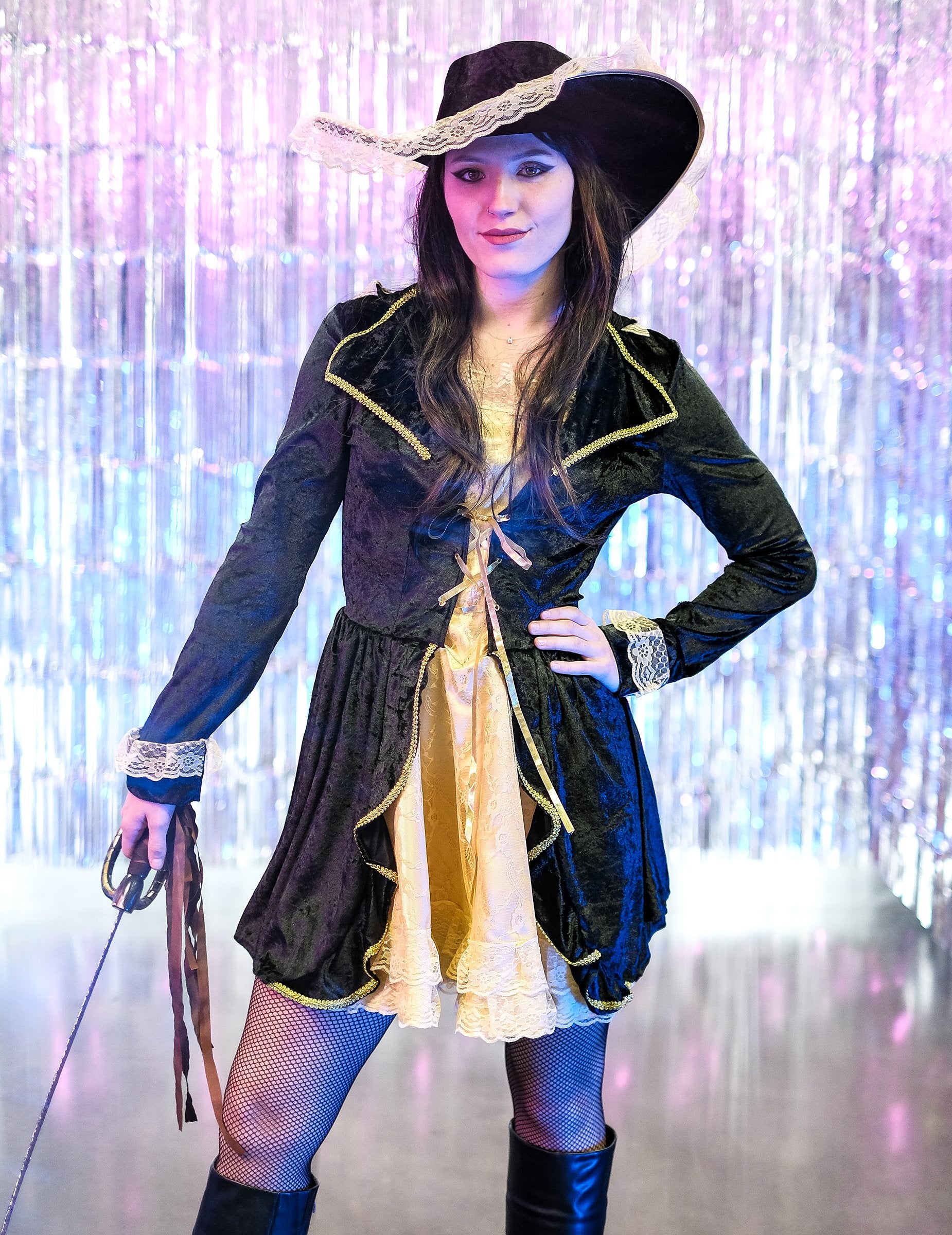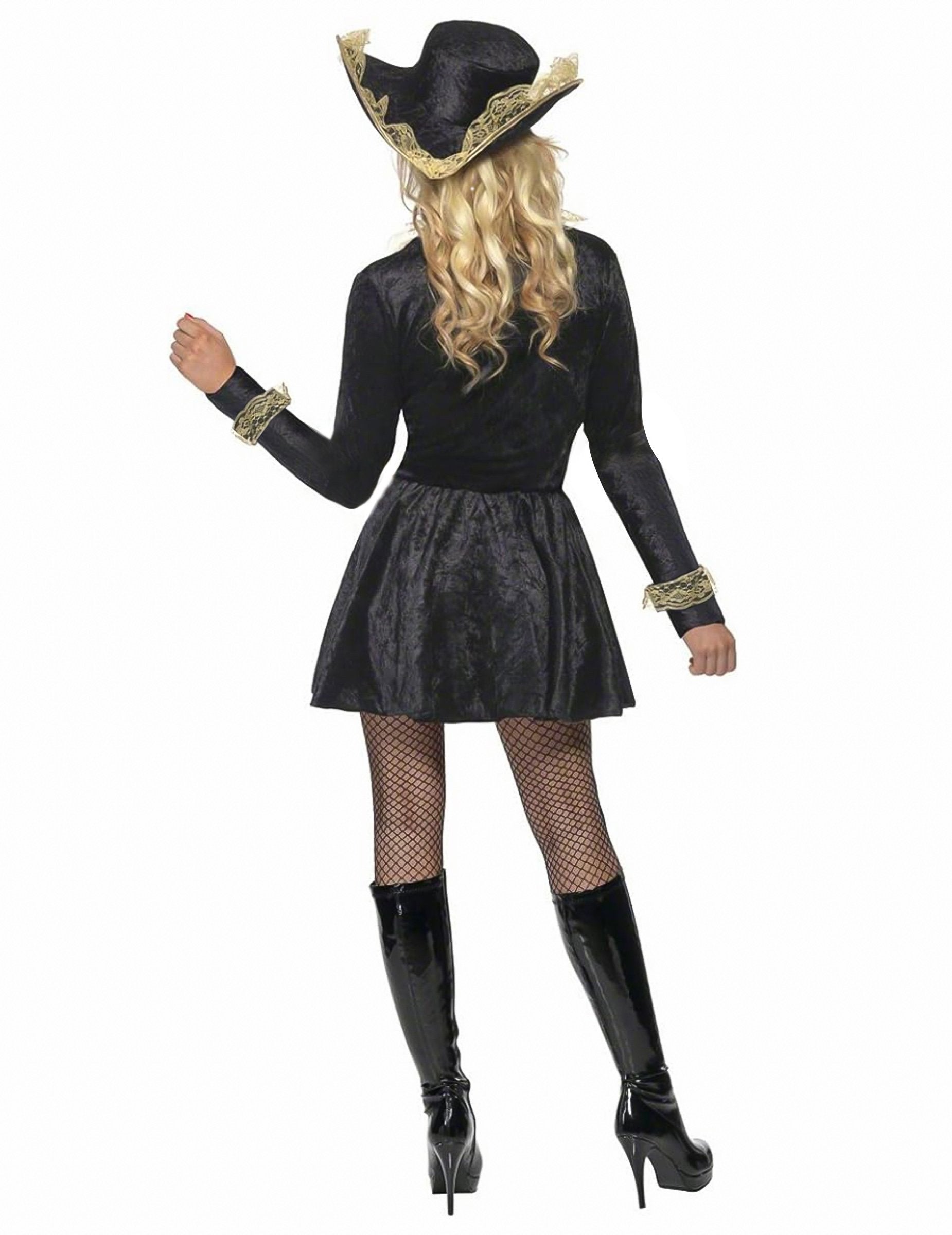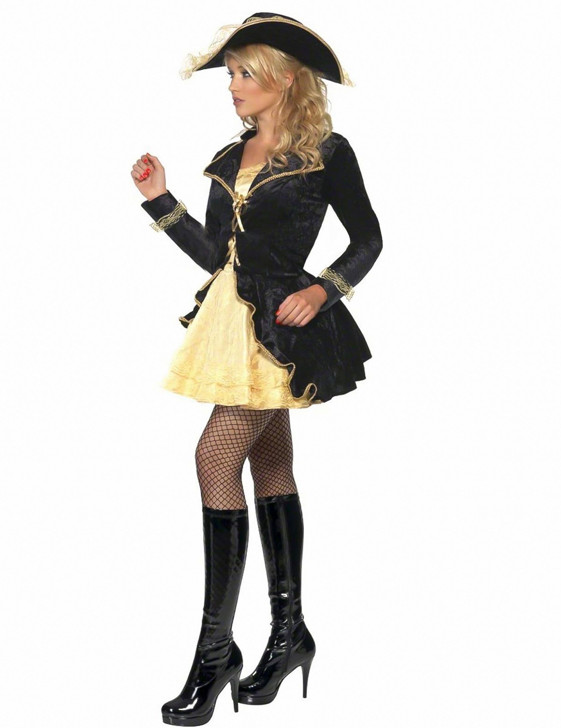 Ez a kalóz jelmez nőknek szól, és tartalmaz egy ruhát és egy kalapot. A ruha két részből áll, összevarrva. Az első a bézs szatén anyagban található, csipkével bélelt. A szoknya hatalmas lesz a szoknya alatt varrott tüllnek köszönhetően. A tetején egy hamis fekete bársony mellény van jelen. A hosszú ujjú, a csipke és az arany zsinór befejezése befejezi ezt a barokk és nagyon szexi szettet. A kalap az álruhára emlékeztet. A fémszíjának lehetővé teszi, hogy alakítsa azt, amikor "Tricorne" hatást szeretne létrehozni. Ez az álruhás ideális lesz egy szexi hajó kapitányainak lejátszására egy álruhás estére vagy bármilyen más lehetőségre, hogy bulizhasson a barátokkal.