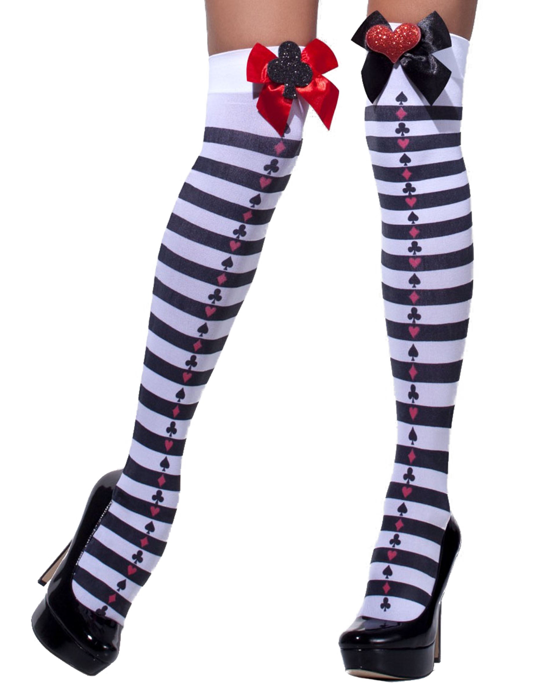Ez a pár átlátszatlan fenekű queen kártyák a nők számára készültek. Csak a térd fölé érkezik. Fekete -fehér csíkok és tüskék, a szív, a lóhere és a csempe a harisnya elejére és hátuljára vannak nyomtatva. Két csomó elöl egy lóhere és egy szív egy szatén piros csomóval. Ezek a harisnya tökéletes lesz a Queen Heart Costume, a Card Queen carnival kártyájának kitöltéséhez!