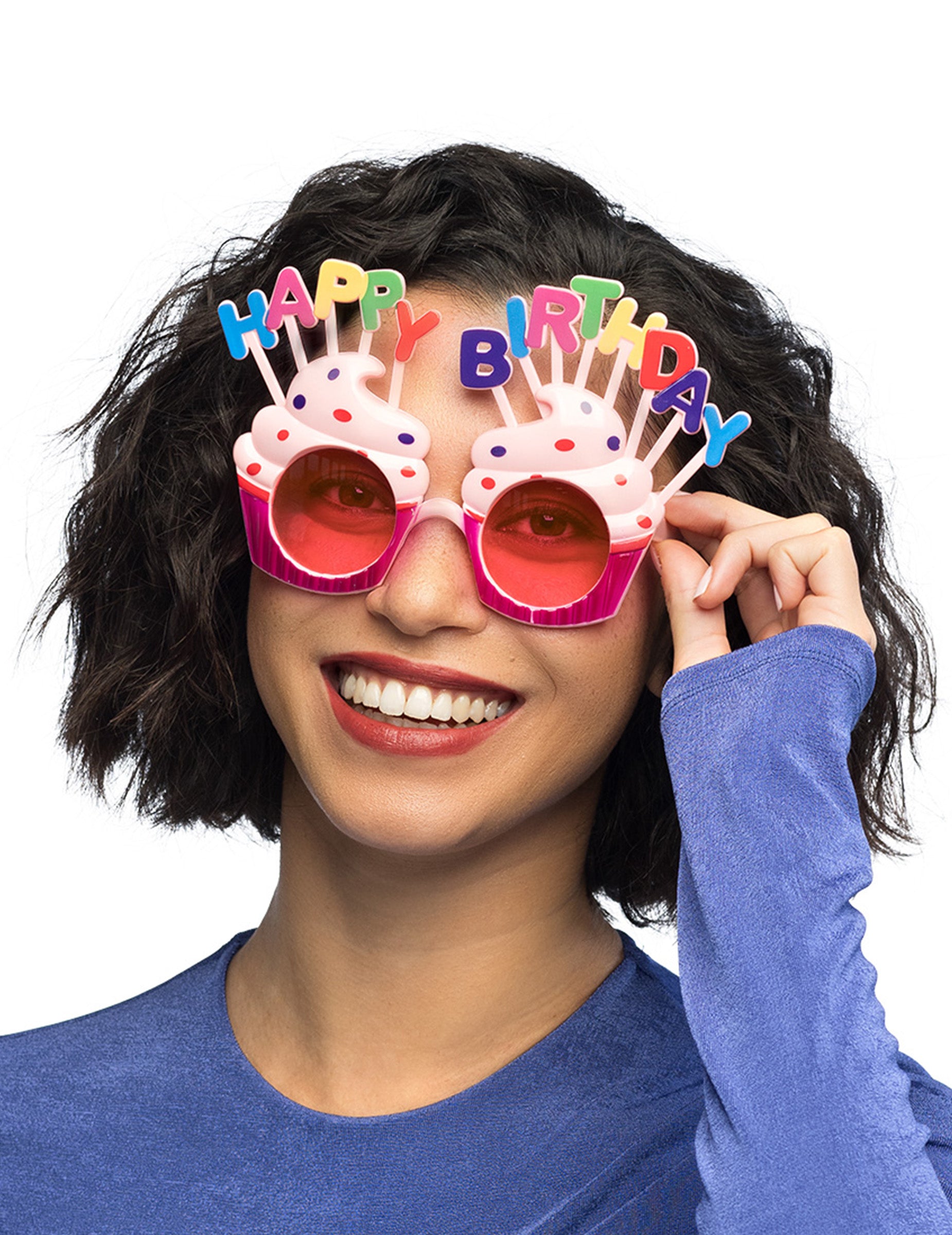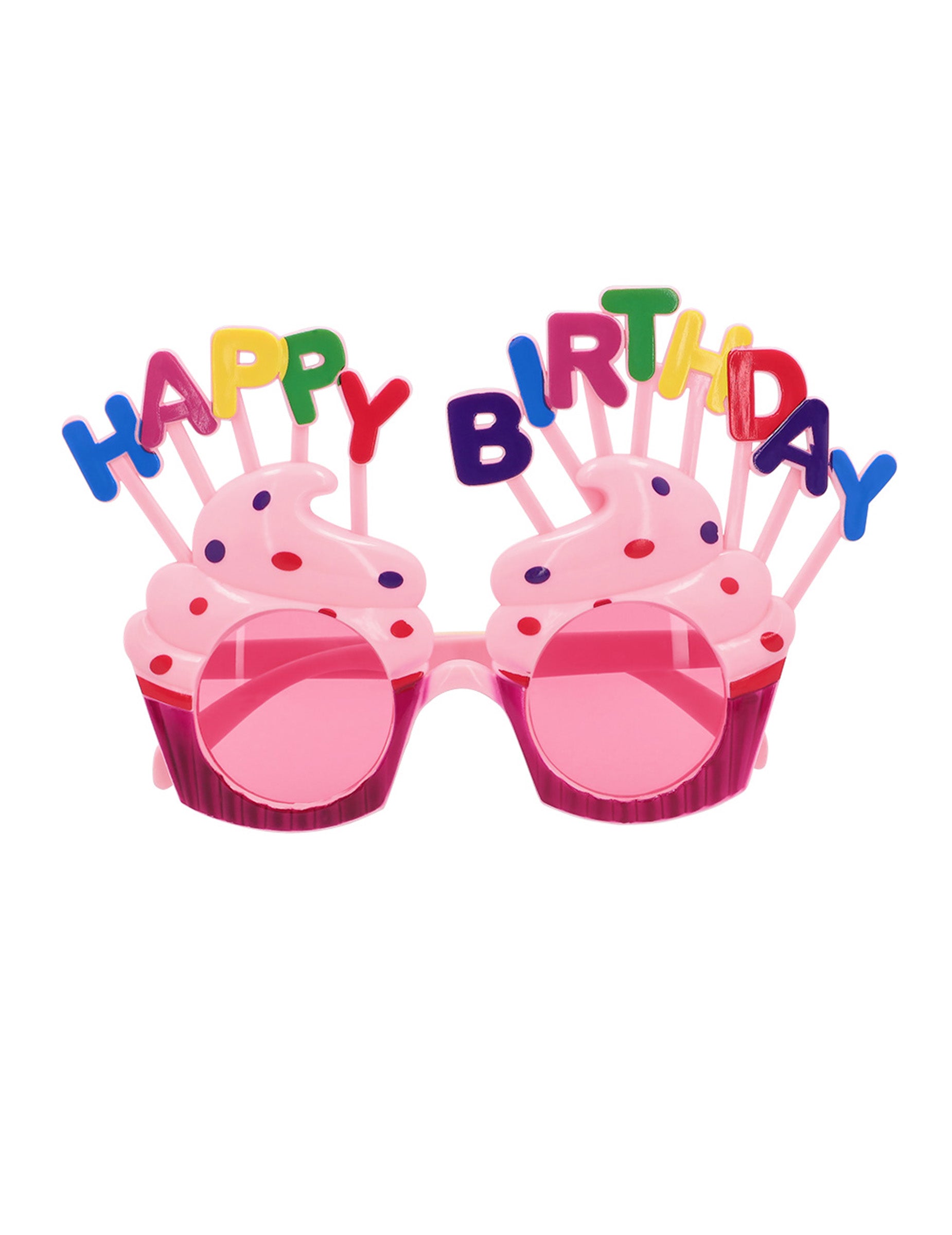 Ezek a boldog születésnapi szemüveg felnőtteknek merev műanyagban vannak. Olyan cupcake alakúak, amelyek alapját rózsaszín flitterek borítják. Az ágak és a cupcakes krém világos rózsaszín. A cupcakes -t hamis színes műanyag gyertyák veszik fel, amelyek a "Boldog születésnapot" üzenetet alkotják. Körülbelül 15 cm szélességűek. Ezek a szemüvegek tökéletesek lesznek a születésnap megünneplésére a barátokkal!