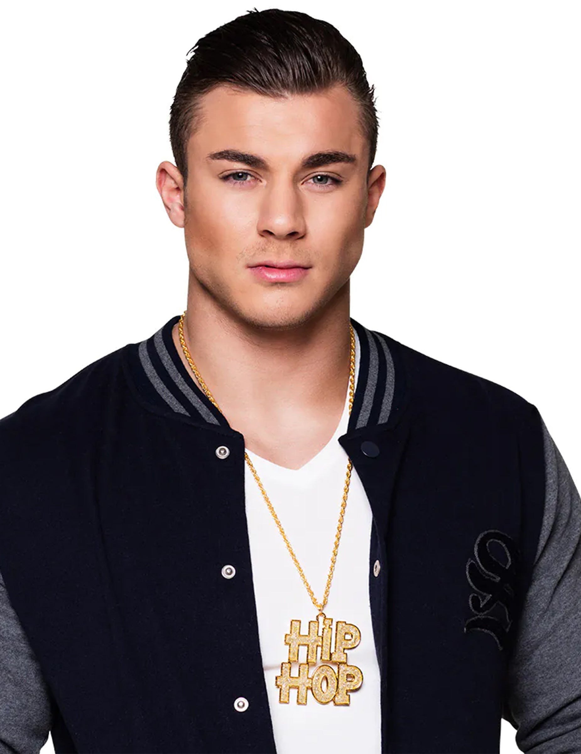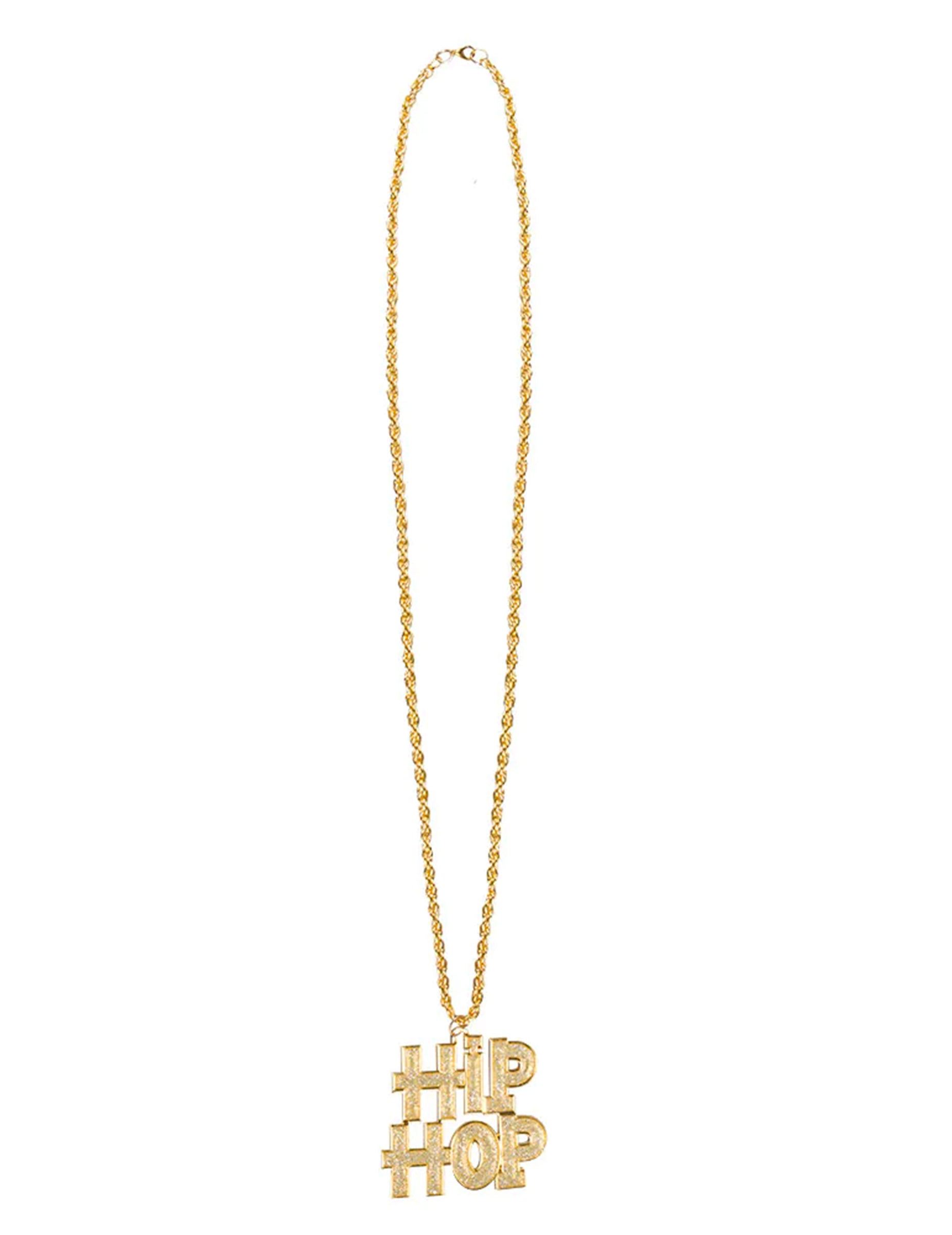 Ez az arany fém nyaklánc láncból és medálból áll. A csavart hálóból álló lánc 41 cm hosszú. A medál 7 cm -rel 7 cm -rel méri, és a "Hip Hop" feliratot viseli. Egy bling bling este alkalmával ez az ékszer tökéletesen öltözi a hip -hop csillag ruháját!