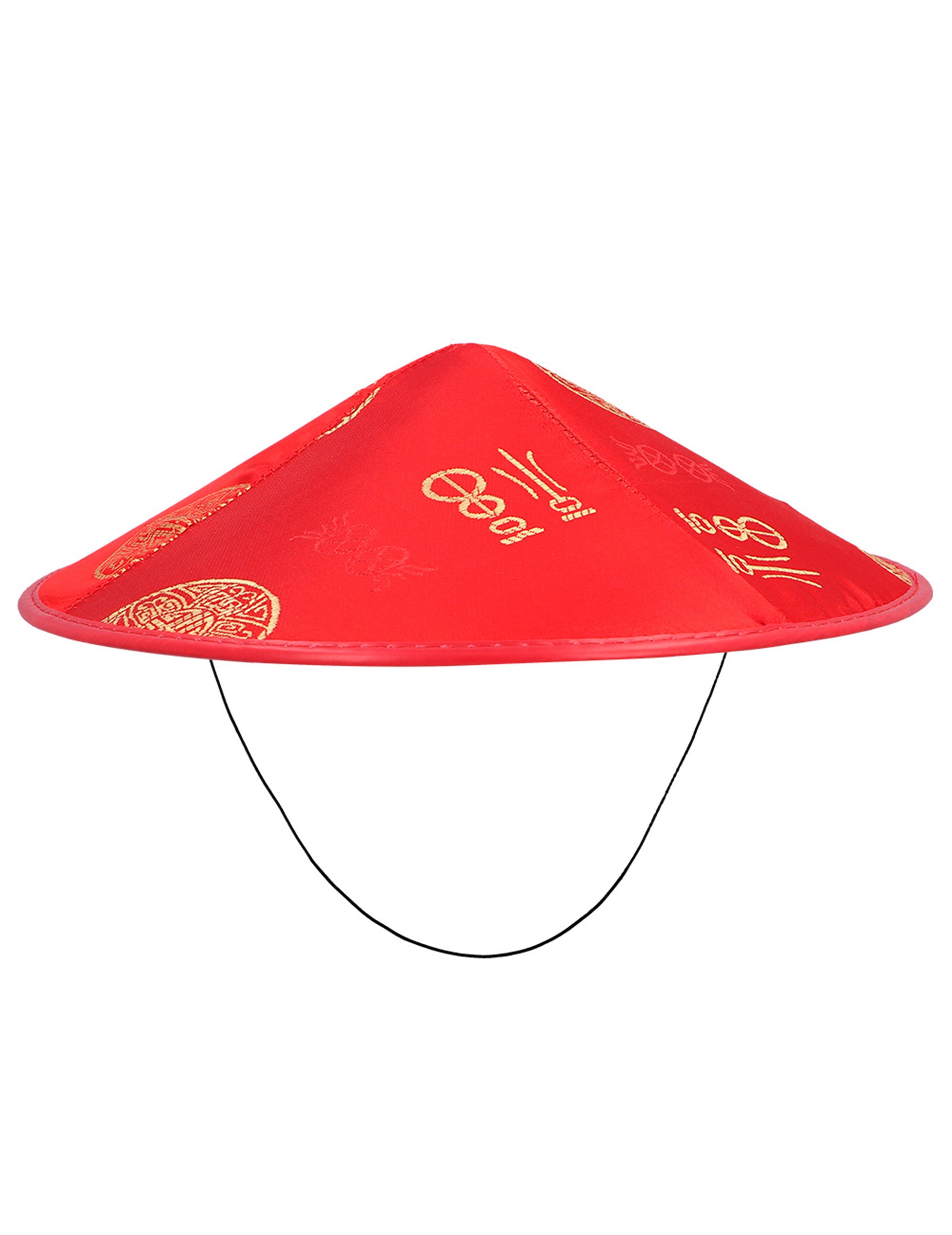 Ez a kúpos alakú kínai kalap felnőtteknek szól. Merev, vörös, szaténhatással, aranyminták vannak jelen a kalap tetején. Ez a tartozék tökéletes lesz a ruhájának befejezéséhez egy esti alkalmakkor a világ témájáról vagy a karneválról.