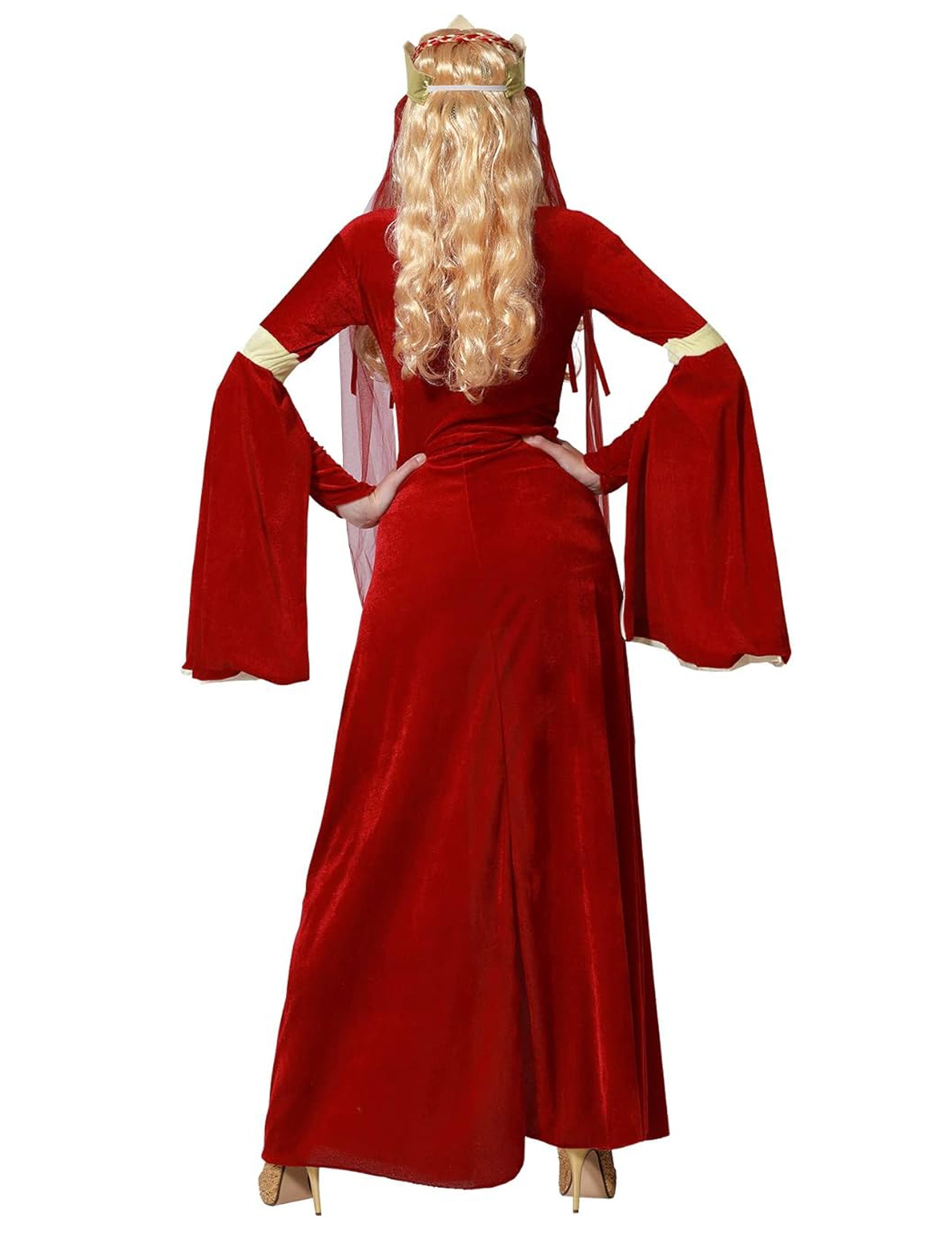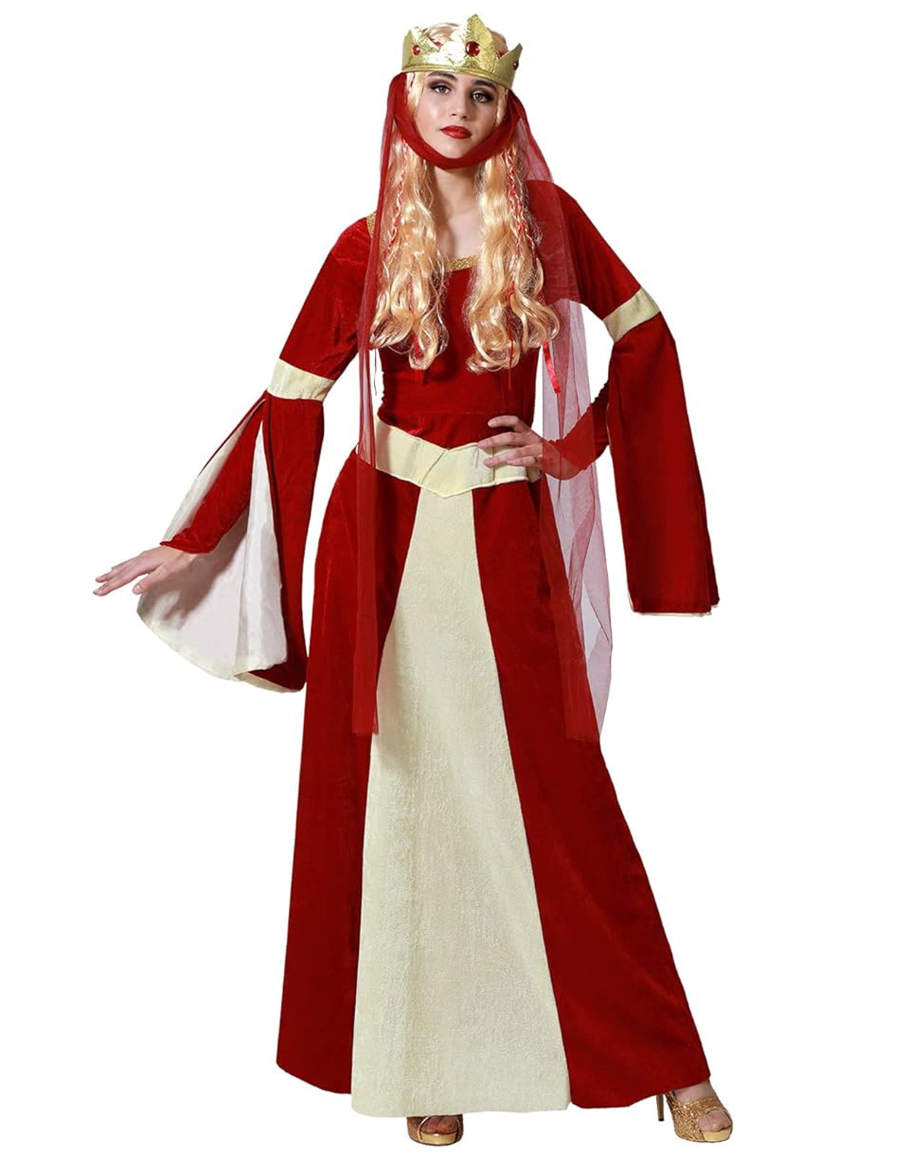 A középkori vörös és arany hölgynek ez a álruhája hosszú ruhából és vitorlással rendelkező koronából áll (paróka és cipő nem tartozik). A bársonyos effektus szövetruhája piros, bézs csíkokkal a könyöknél és az elülső oldalon. A ruha teteje négyzet alakú nyakkivágással díszített arany kivitelben van díszítve. A piros hosszú ujjú, fellendezett túltartókból állnak, a belső terekkel lágyított bézs színű. A bézs hamis övet a derekán varrják. Az aranykorona habból készül, a maximális kényelem érdekében. Elasztikus használatával fenntartják. 3 hamis piros drágakővel és egy hosszú, közvetlenül rajta varrott hosszú vörös fátyol díszíti. A fátyol az álla alatt áthalad, és az oldalán lóg. Ez az álruhás ideális a karneválhoz vagy egy álruhás estéhez!