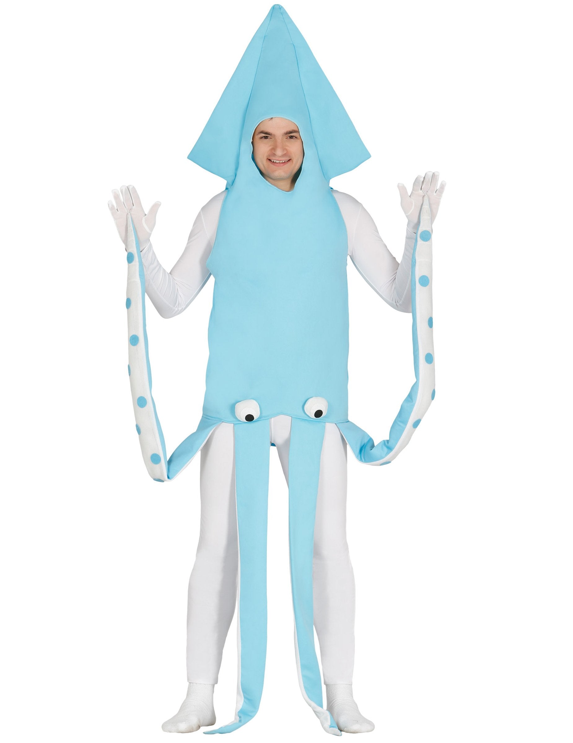 Ez a felnőtt calamar jelmez egy tunikából áll (fehér felső, kesztyű és nadrág nem tartozik). Ez a finom hab tunika égkék színű. Ez egy calamarot képvisel, a fej szintjén lévő hegyével. 2 szemet varrnak a tunika alján. Kék és fehér csápokat is talál, amelyek kék rozgókkal ábrázolják a szívó csészéket. Ezek a csápok körülbelül 100 cm hosszúak. Ez a csáp 2 után elasztikus hurok van jelen, így átadhatja azokat az ujjának. Ennek a tunikának a feje széles nyílása van, és hátulba záródik a karcolások segítségével. Kiváló lesz az állatok karneválra történő megváltoztatásához.