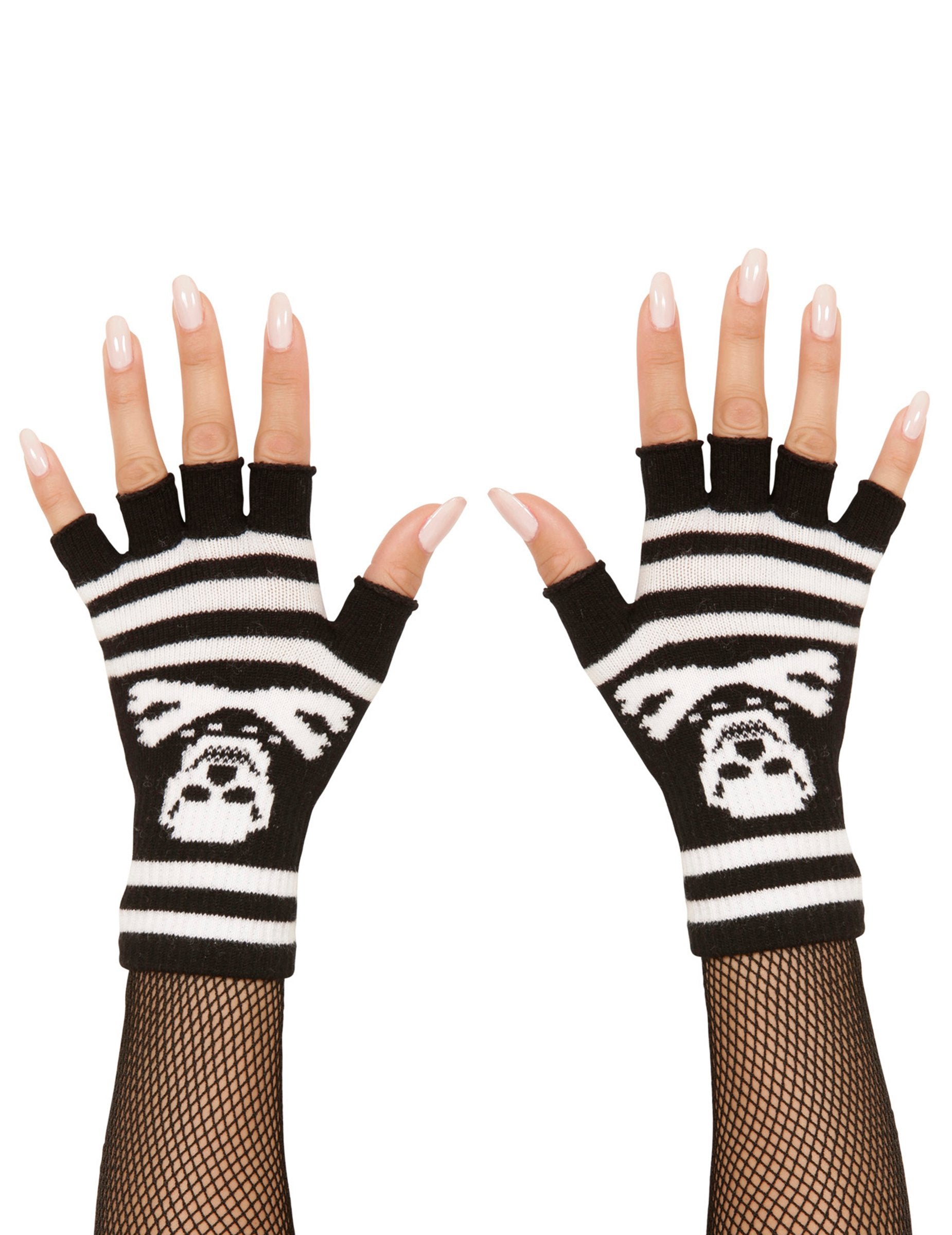 Ezek a felnőtteknek szóló kesztyűek fekete, fehér csíkokkal, és a kéz hátulján fehér kalózfej díszíti. Körülbelül 28 cm hosszúak és felnőtteknek felelnek meg. Ezek a kesztyűek ideálisak lesznek a Halloween jelmez vagy az álcázott este kitöltéséhez! Copyright Widmann SRL