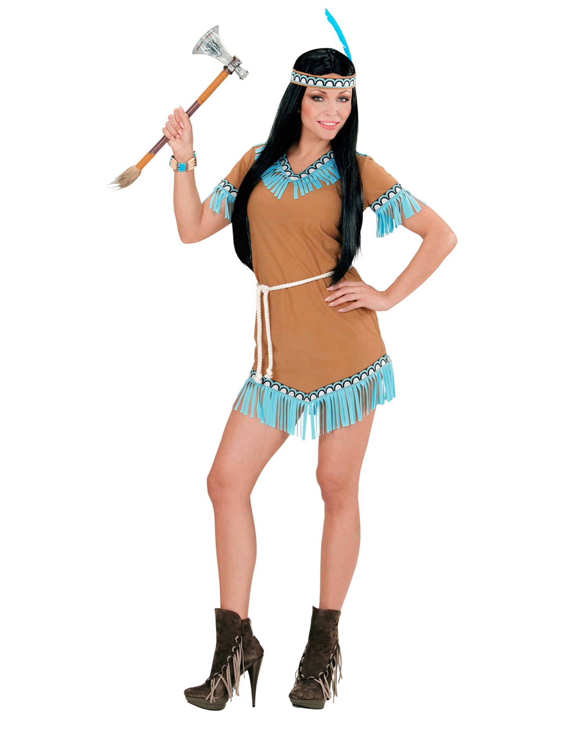 Ez a nők számára ez a kis indiai álruhás ruhából, övből és fejpántból áll. A rövid ujjú ruha barna színű. Kék, fekete -fehér mintákkal és világoskék rojtokkal ellátott zenekar díszíti a nyakán, az ujjakkal és a ruha alján. Az oldalsó cipzár lehetővé teszi, hogy könnyen elhelyezze. Az öv körülbelül 170 cm hosszú fehér színű szövetkötélből áll. Csak a méreted körül kell kötnie. A zászló ugyanazokat a mintákat veszi fel, mint a ruhában. Egy hosszú kék műanyag toll van az oldalán. Elasztikus használatával fenntartják. * Ez az indiai jelmez ideális lesz karneválra vagy bármilyen más ünnepi rendezvényre!