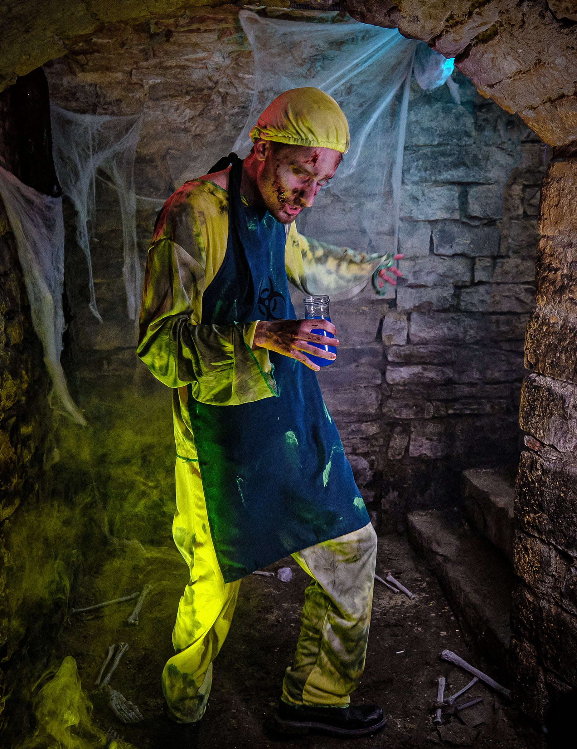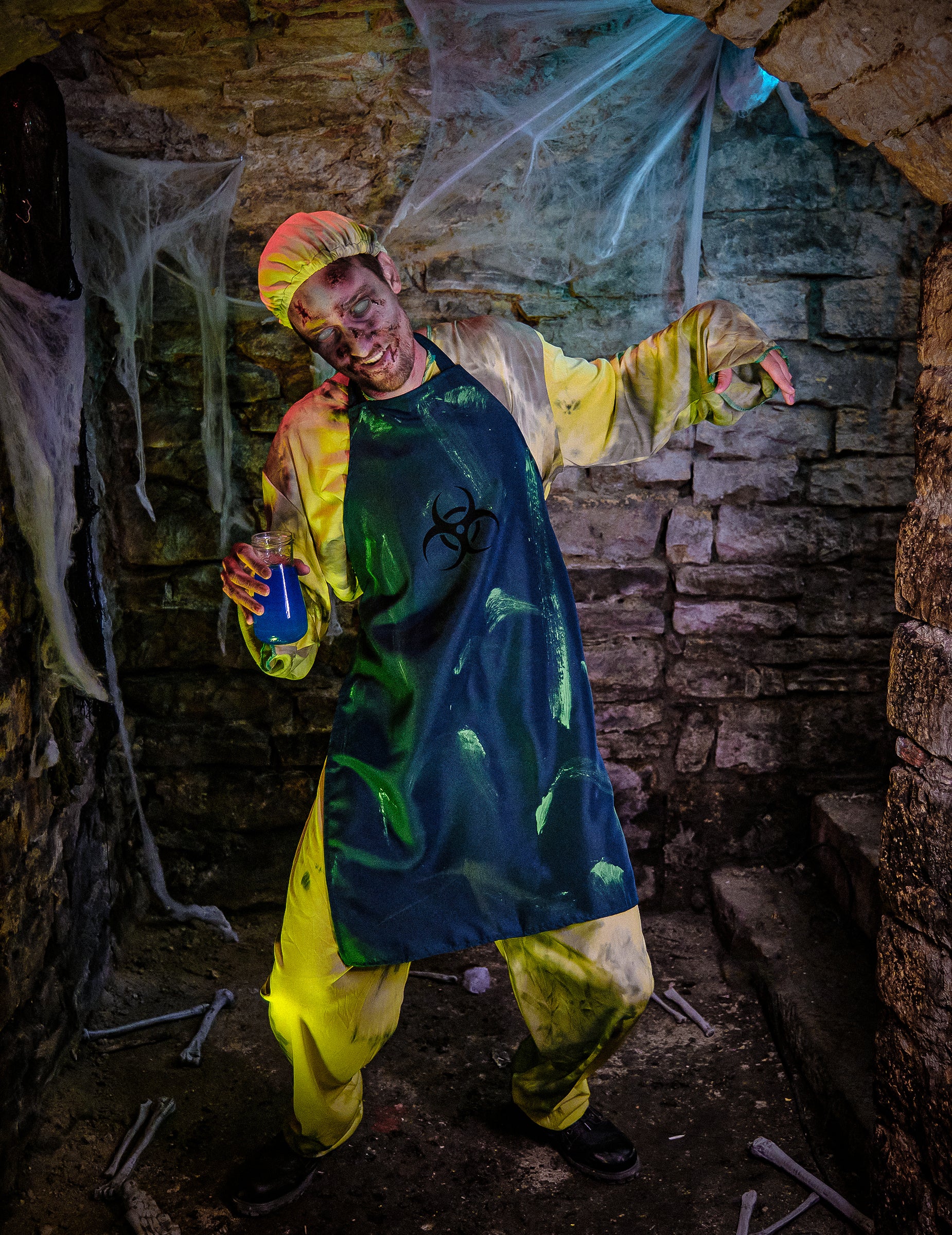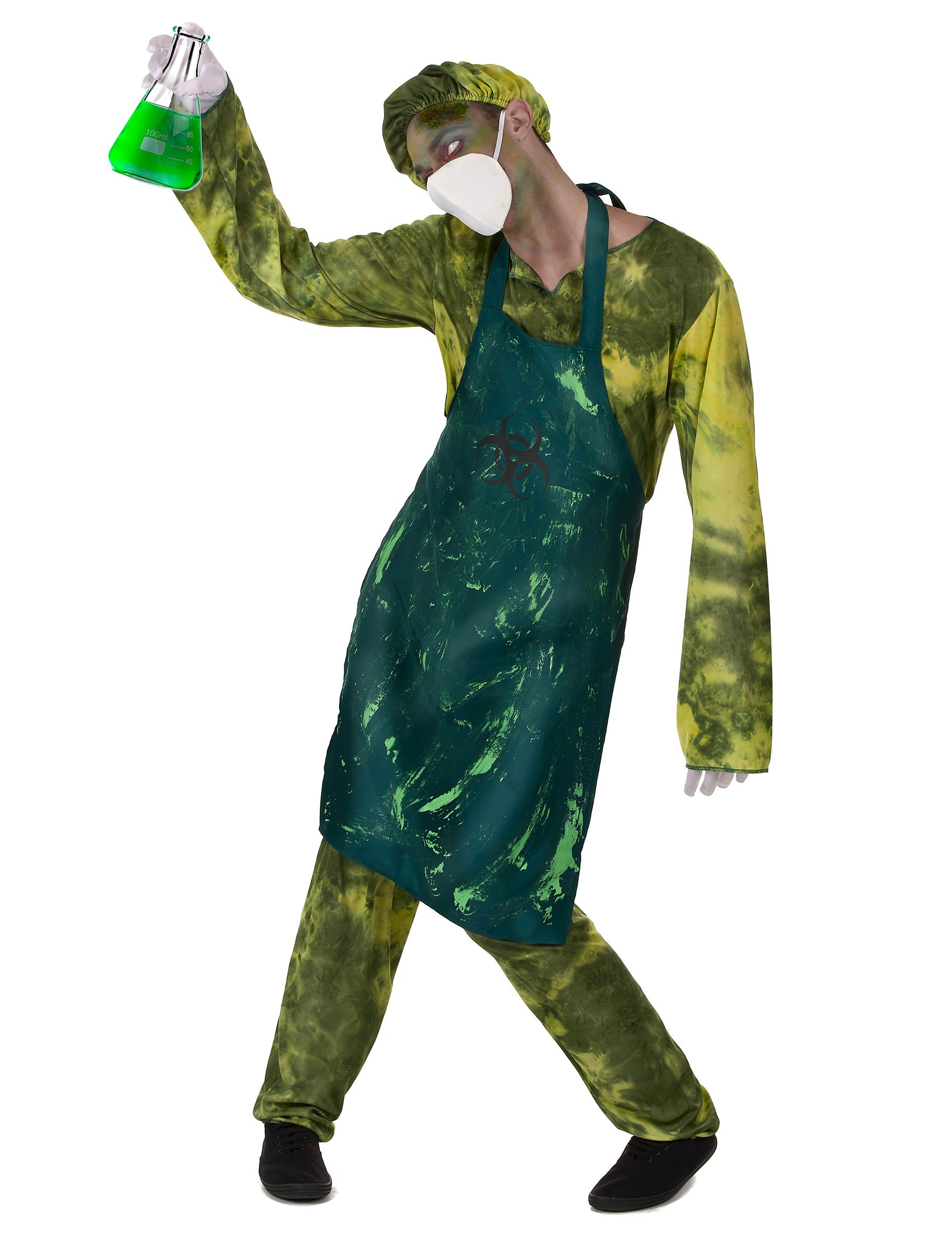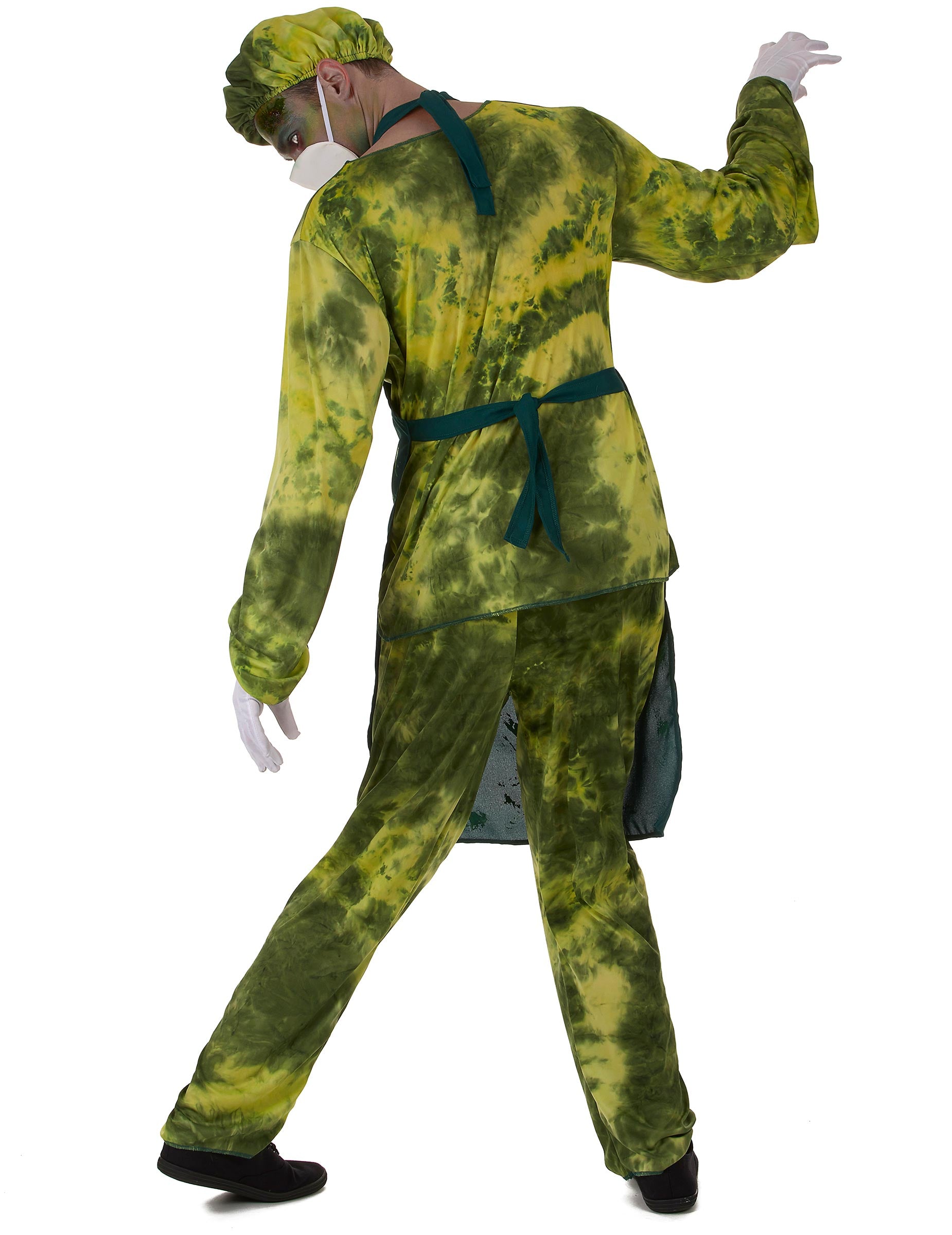 Ez a radioaktív sebész férfiak jelmeze pólót, nadrágot, kötényt, maszkot és fejdíszet tartalmaz. A felső, a kupak és a nadrág rugalmas anyagban zöld. A nyomtatás megjelenése világoszöld és sötétzöld színű anyagot idéz elő. A pakli vastagabb anyagban sötétzöld, hamis fluoreszkáló zöld vérrel festett. A nyak mögött és a derék körül van rögzítve. A "biológiai veszély" piktogram a törzs szintjén fekete színű. A maszk egy darab fehér habdarabból áll, hogy a száj előtt elhelyezkedjen, és egy fehér rugalmassággal rendelkezik. Ez a készlet nem fog elmulasztani a barátait egy álcázott parti vagy karnevál alatt.