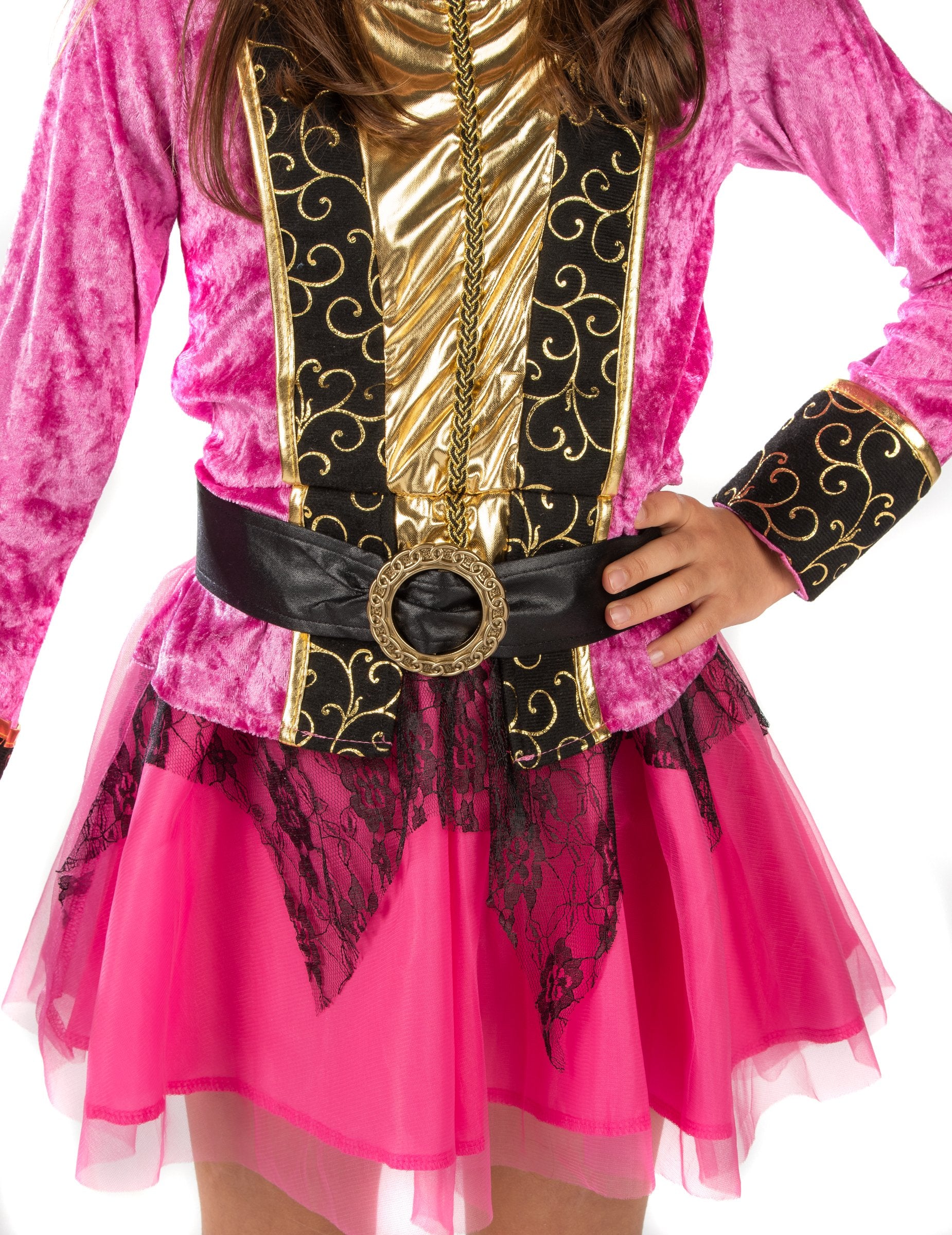 Ez a kalóz álruhában egy ruhát, kalapot és övet tartalmaz. A hosszú lélű ruha a rózsaszín bársonykabát és a fekete ragyogó arany Arabesque részét, valamint a hamis fényes arany mellkasát tartalmazza. A rózsaszín rugalmas szövet szoknya tüll béléssel rendelkezik, amely az egész hangerejét növeli. A kalóz kalapja alkalmas lesz az 56 -hoz közeli fejtornyokhoz cm hozzávetőlegesen. Vastag fekete filcből készült, rózsaszín bársonycsík van jelen, mint a ruha emlékeztetője. Az öv fekete, műanyag hurokkal. Szövetsége a bőr és a karcolások hátulján megjelenik. Ez a kalóz álrizó ideális a kalóz történetek kislány rajongói számára. Tökéletes kapitány lesz egy születésnapi snack alatt vagy karneválra.