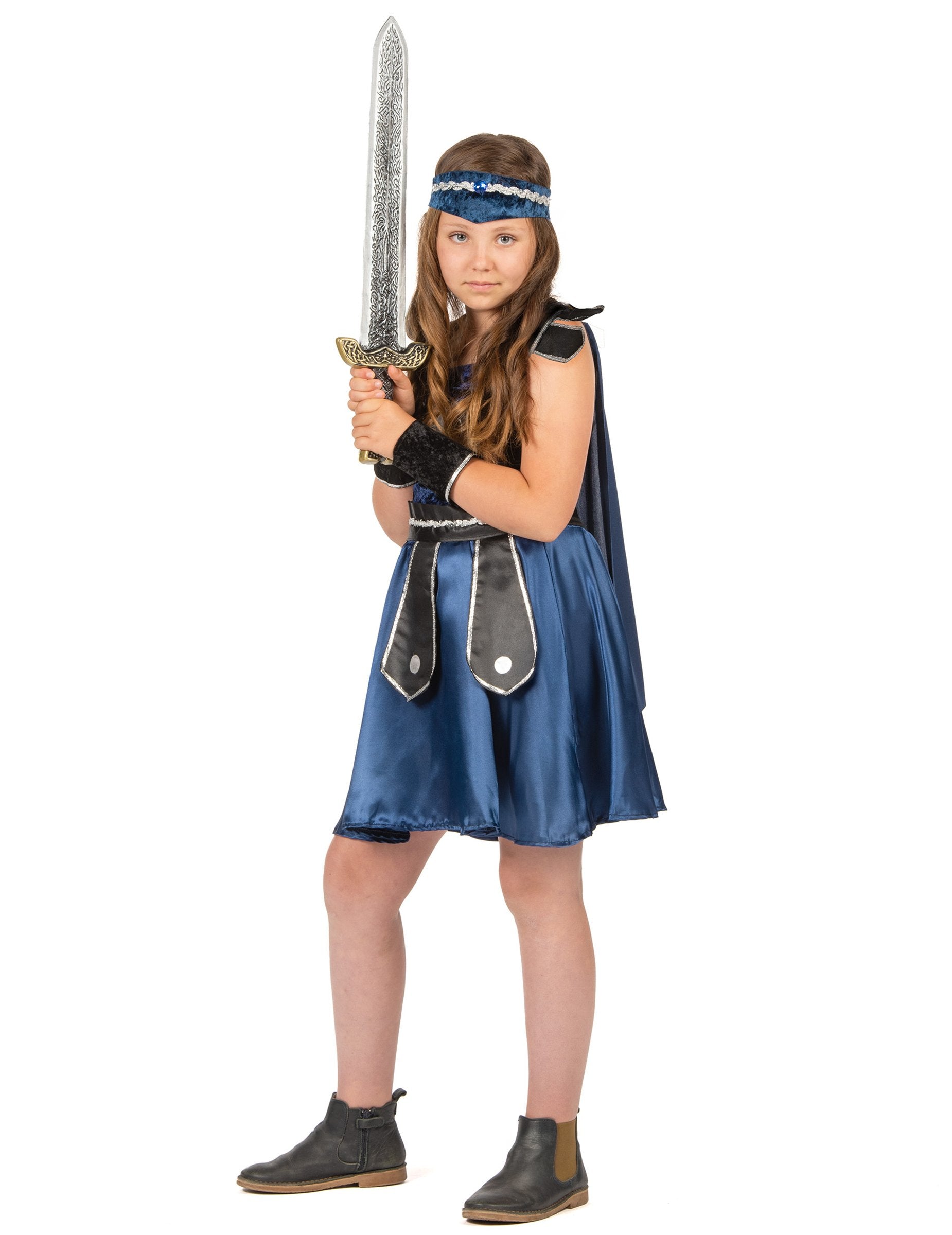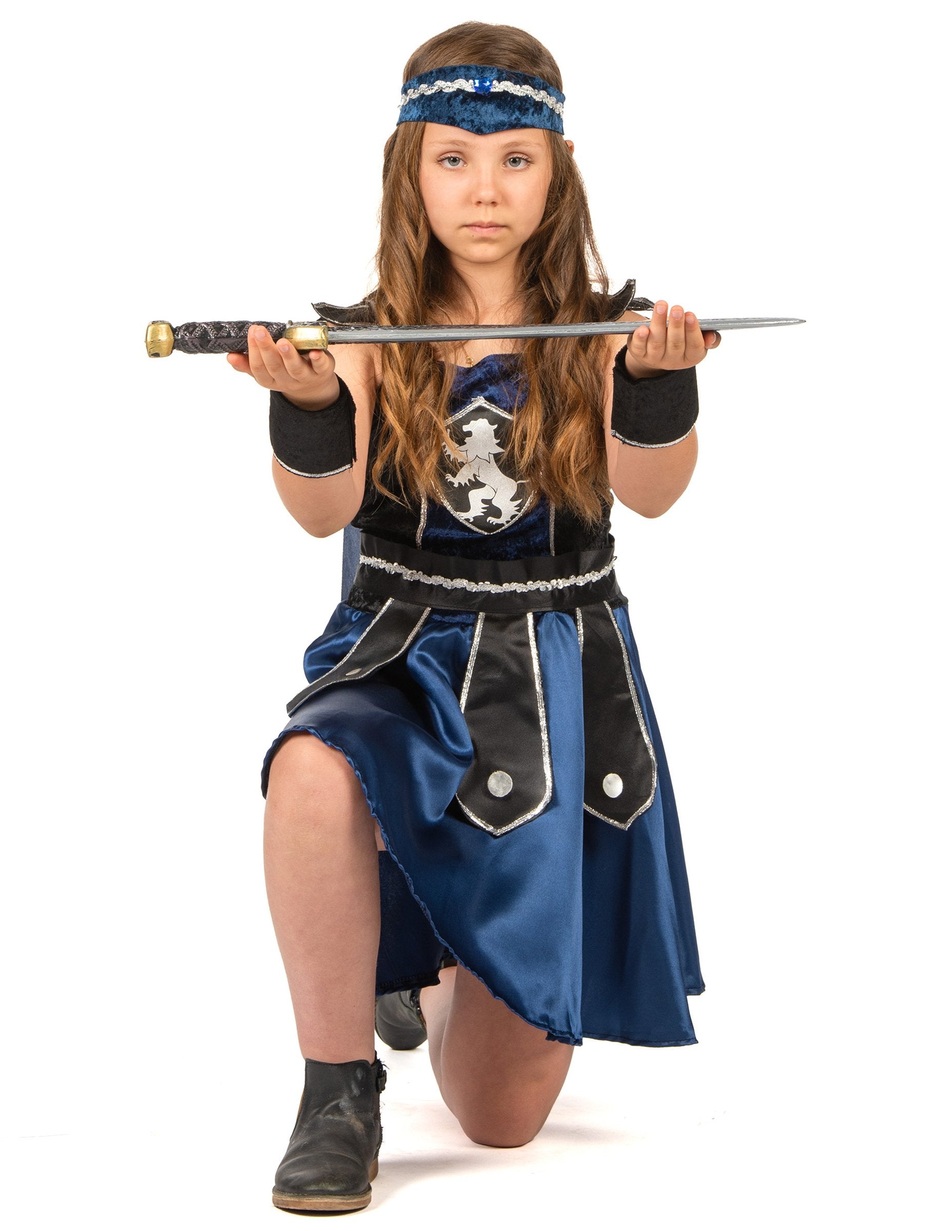Ennek a lovagnak a lány álruhája ruhából, köpenyből, egy pár mandzsettából, övből és egy szalaghirdetésből áll (cipő nem tartozik). A kék és a fekete ruha bársonyos szövettel rendelkezik a tetején, az alján szatén. Az elülső részén jelvényt varrnak. A sötétkék köpeny a ruha hátulján karcolódik. Az öv fekete és ezüst, az elülső tippekkel. Egy nagy karcolással bezárul. A fekete mandzsetta bársonyos hatás a karcolásokkal is zárva van. Az Elaestic Banner éjfélkék és ezüst. Ez a lovagi jelmez tökéletes lesz a karneválhoz.