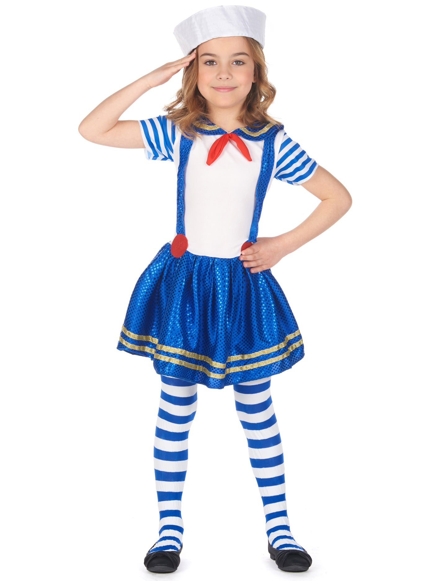 Ez az övek álcázása ruhából áll. A ruha teteje fehér, rövid ujjú, fehér és kék csíkokkal. Az elülső oldalra varrják a csapokat és a csillogó gallérral. A ruha alja ugyanabból a kék csillogó anyagból készül. Ez a ruha a karcolás segítségével bezáródik a hátuljában. Ez a tengerész jelmez tökéletes lesz a karneválon való részvételhez.