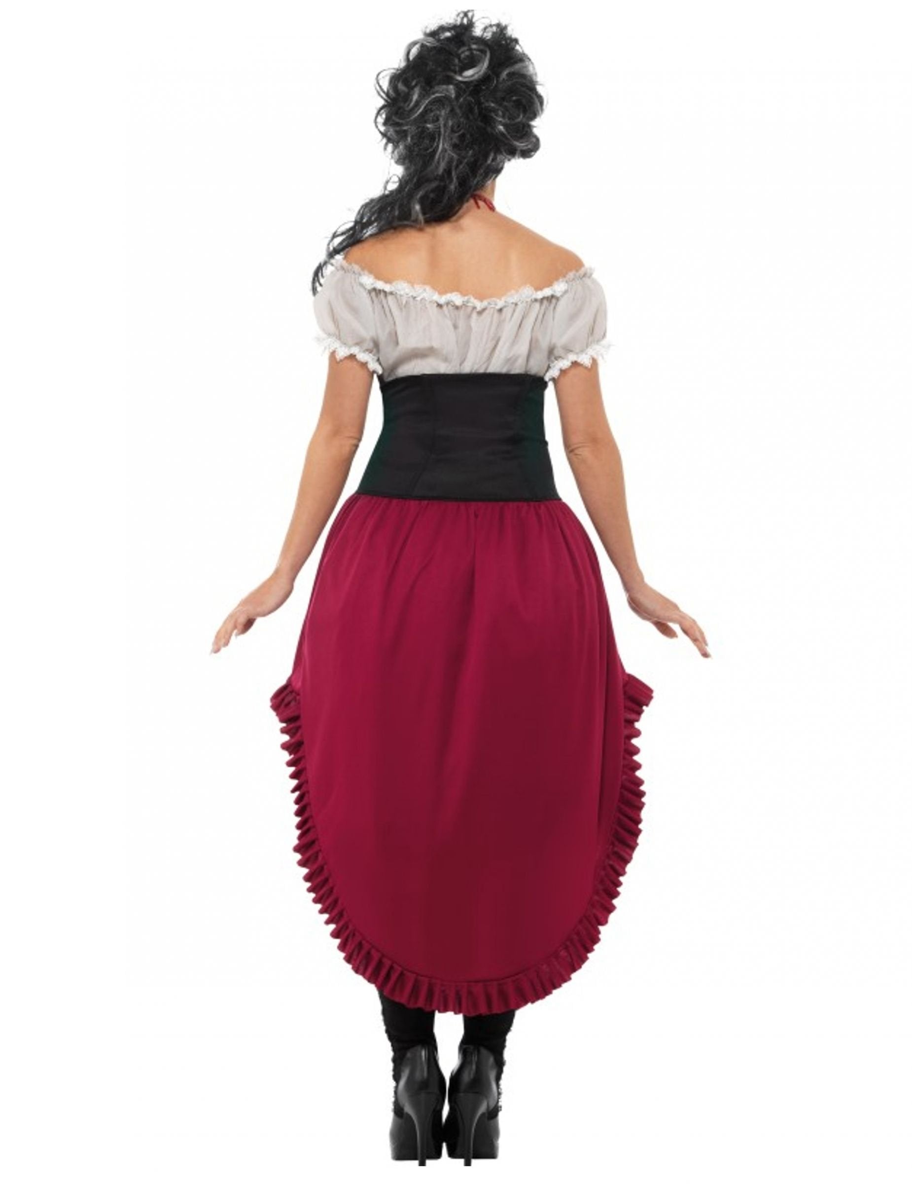 Ez a véres szellemp kalóz jelmez nőknek tartalmaz egy ruhát, egy fűzőt és egy felsőszoknyát (paróka, nyakpánt, harisnya és cipő nem tartozék).