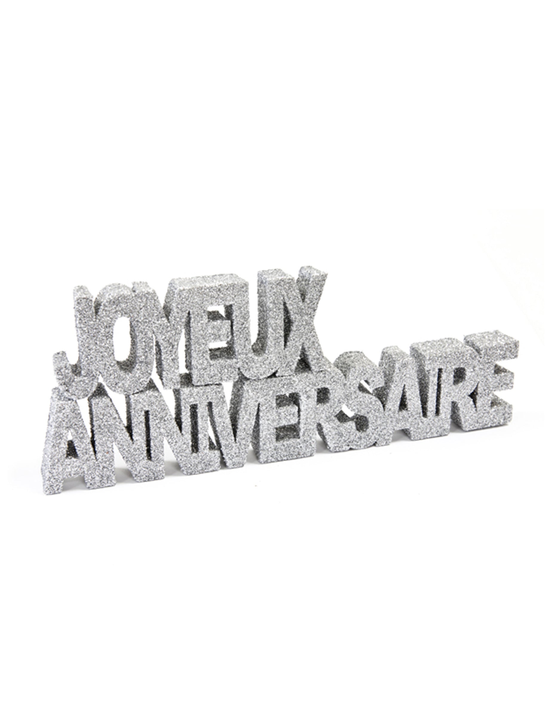 Ez a táblázat dekoráció a "Boldog születésnapot" üzenetet képviseli. Teljesen ezüst flitterekkel borítva. A két szó leszerelhető, amely lehetővé teszi a különböző dekorációk létrehozását: felülmúlja őket, vagy hozzáigazítsa őket a vágyához. Körülbelül 9 x 3,5 x 1,5 cm ("örömteli") és 19 x 3,5 x 1,5 cm ("születésnap") mérik. És a testreszabás érdekében szórakoztassa a színek keverését, hogy egyedi dekorációt hozzon létre! Ez az asztali dekoráció ideális lesz a születésnapi partijához!