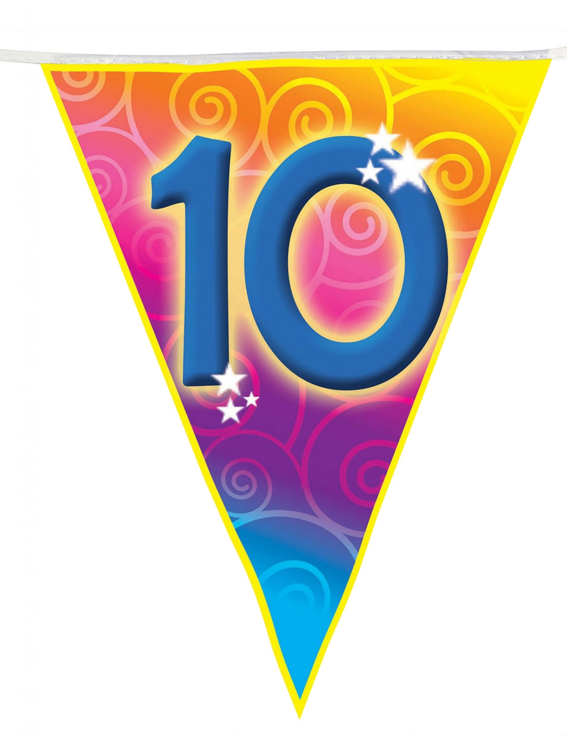 Ez a zászló koszorú körülbelül 5 m hosszúságú. 10 zászlóval rendelkezik, amelyen csillagokat nyomtatnak a 10. szám körül, mindegyik színes háttérrel. Ez a Garland tökéletes lesz a születésnapi partira való dekoráció befejezéséhez.