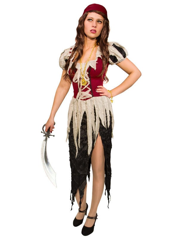 Ez a nők számára készült Boucanière jelmez ruhából és egy bandanából áll. A ruha egy olyan tetőből áll, amely egy piros fűzőt utánoz egy négyzet alakú nyakkivágással, amelynek fehér fűzője van, amely lehetővé teszi, hogy a derekához beállítsa. A szakadt fekete szoknyának combja van. A derékon és a galléron lógó fehér szövet -hegyek díszítik, amelyek szimulálják a szakadt anyag lógását. A fekete -fehér rövid ujja puffadt. A megfelelő vörös bandana befejezi a ruhát. Ez a nők számára ez a Boucanière jelmez tökéletes karneválra vagy a kalózkodás témájára álcázott estére.