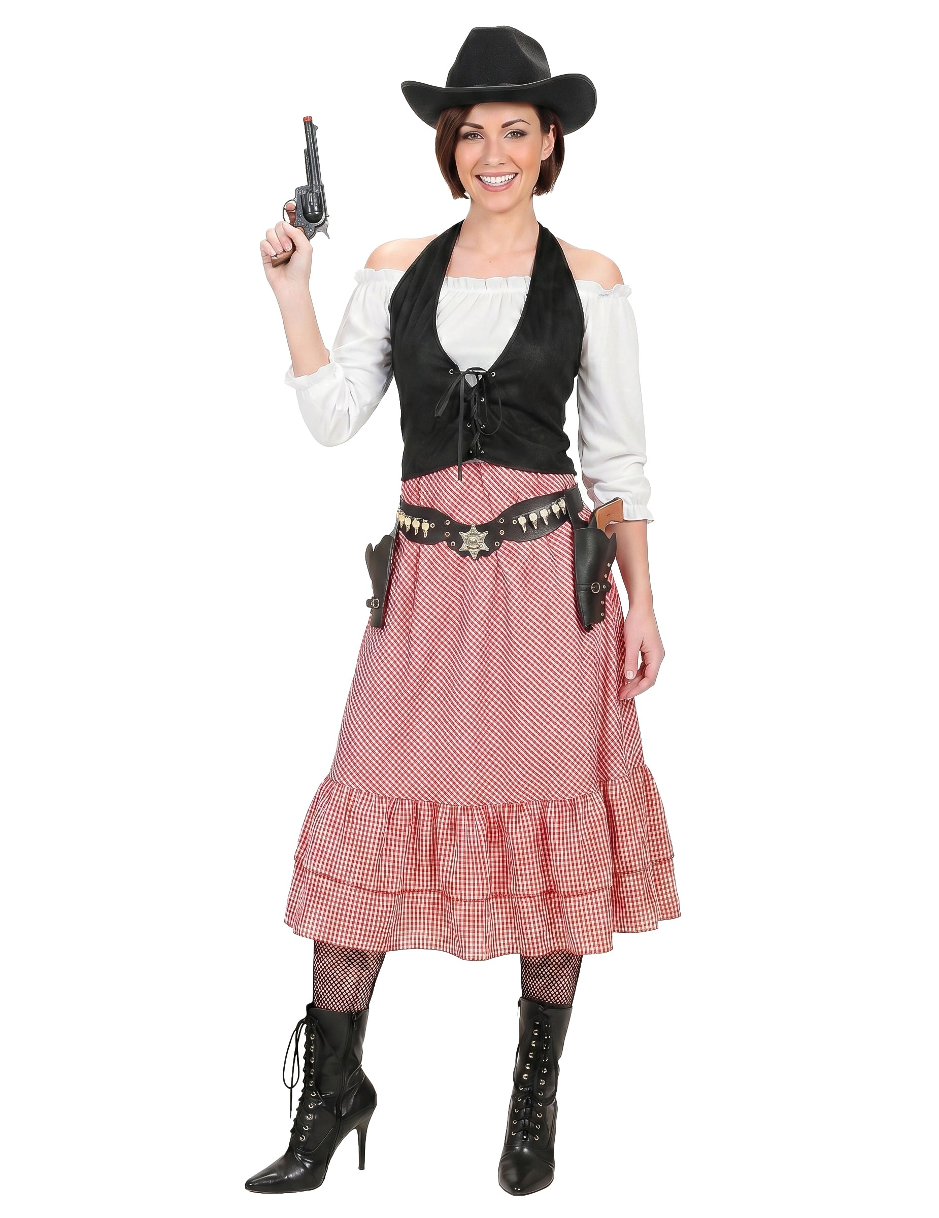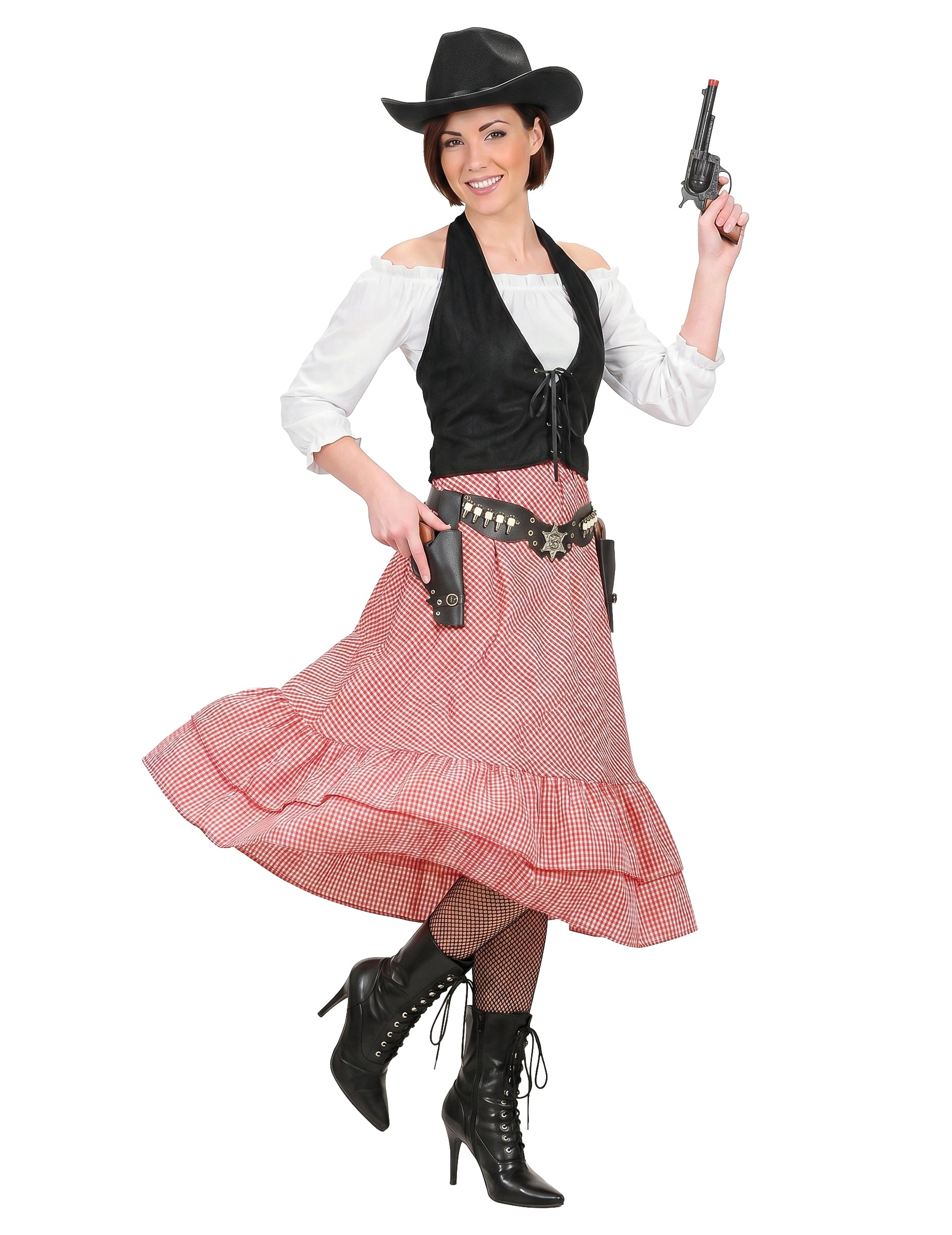 Ez Western jelmez nőknek Tartalmaz egy felsőt és egy szoknyát (sapka, öv, harisnyanadrág, cipő és revolver nem tartozék).