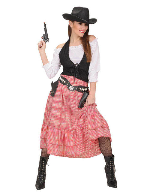 Ez a nyugati nő jelmez egy felső és szoknya (kalap, öv, harisnya, cipő és revolver nem tartozik). A fehér ing csupasz vállak és fekete csipkék fűzővel rendelkezik. Ami a szoknyát illeti, hosszú fodrokkal, vörös és fehér csempékkel nyomtatva. Ez a cowgirl jelmez ideális lesz karneválra vagy egy nyugati estére! Copyright Widmann SRL