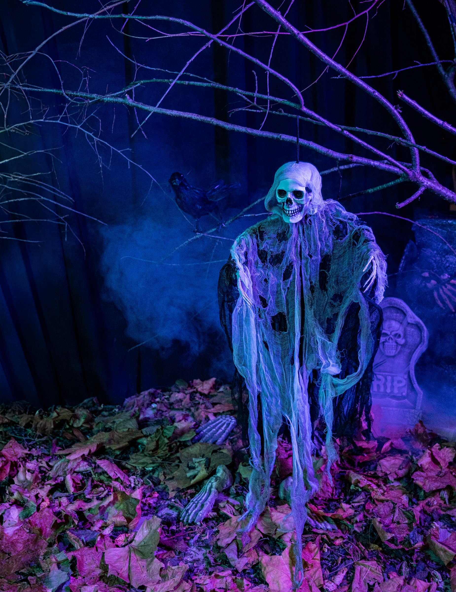 Ez a függő fűnyíró, amelyet lógni kell, egy műanyag fejből áll, két deformálható kar csontváz kezével és szakadt szövetekből áll. Karok nyitva, körülbelül 60 cm széles mérete 1 méter magas. Körülmény lesz, ha a Halloween partiján a Horror Este hangját határozza meg.