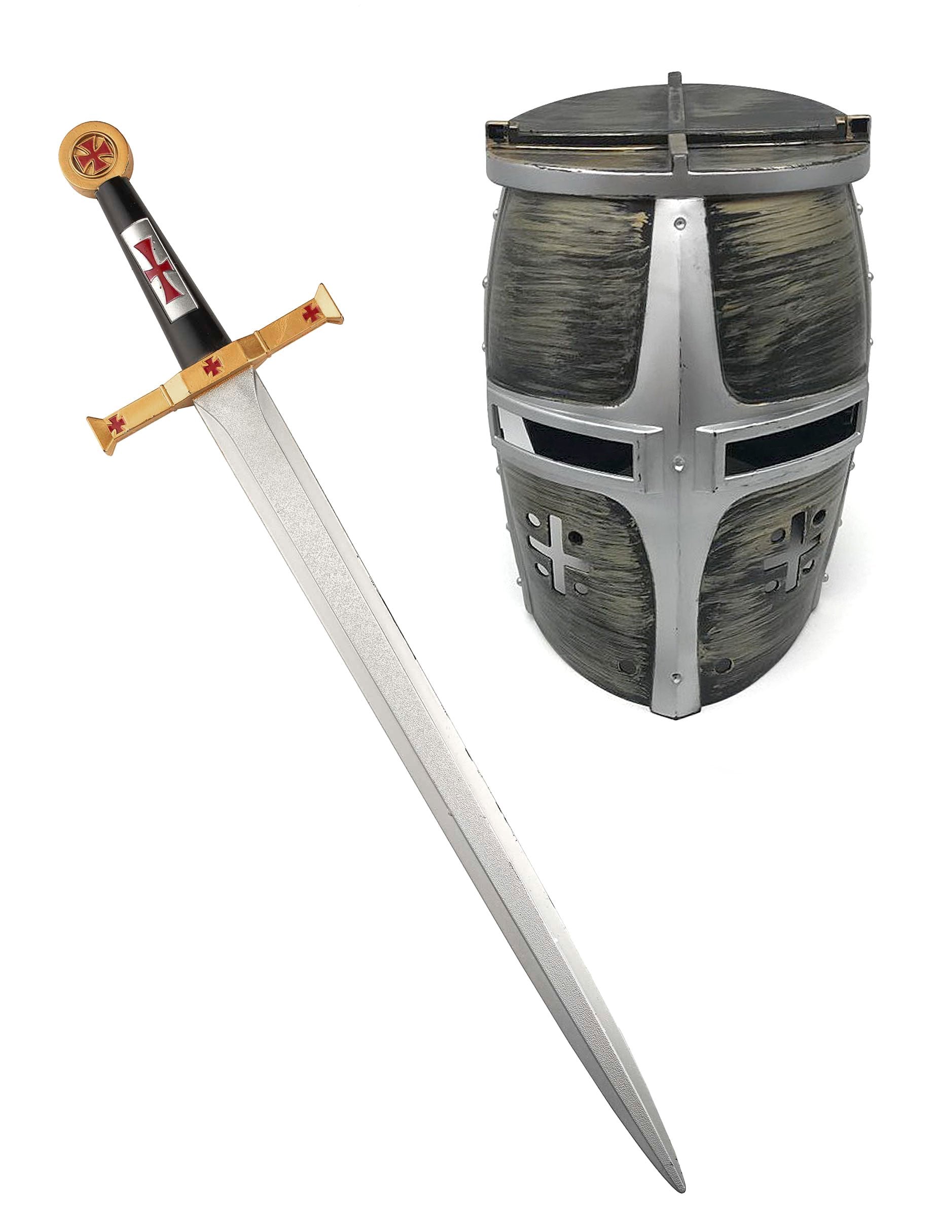 Ez a kard és ez a gyermekes sisak műanyagból készül. A kard, nagyon részletes, körülbelül 50 cm. A sisakot, merev műanyagban, felére kell hajtani a fején és a kliphez. A jó látás biztosítása érdekében nyitva áll az elülső oldalon. Ezüst színű és egy régi aranyhatás. Ez a Preux Warrior méltó készlete tökéletes lesz, hogy befejezze gyermeke lovagjának álruháját!