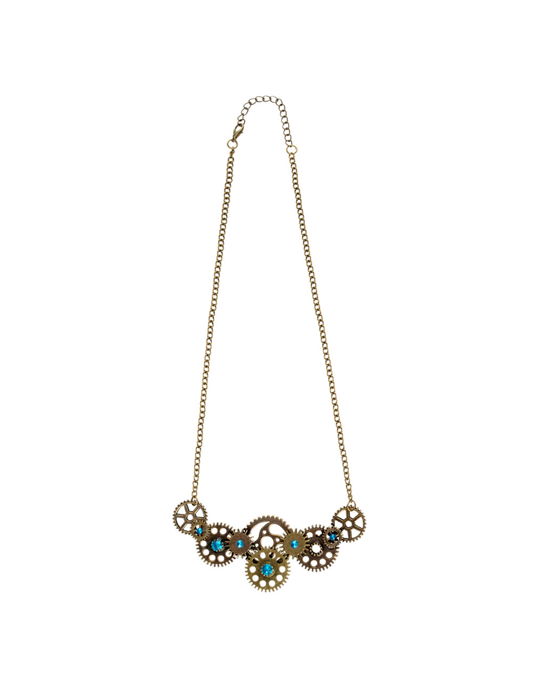 Ez a felnőtt steampunk nyaklánc fémből készül. Ez egy idős effektusláncot képvisel, amelynek medálja különböző méretű fogaskerekekből áll. A kék strasszok színt hoznak a medálba. Ez a nyaklánc tökéletes lesz a steampunk jelmez befejezéséhez egy álcázott este alatt.