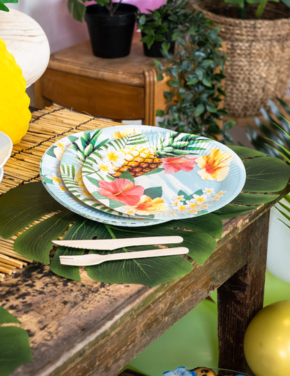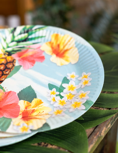 Ez a 10 kartonlemez -tétel kiváló Hawaii témájú, Immripimé. Ezek a lemezek átmérője körülbelül 23 cm. Egy ananász, hibiszkusz és frangipanier virág, váltakozva élénk színekben, és minden bizonnyal színt tesz az étkezésre egy téma nyári partiján vagy születésnapjára!