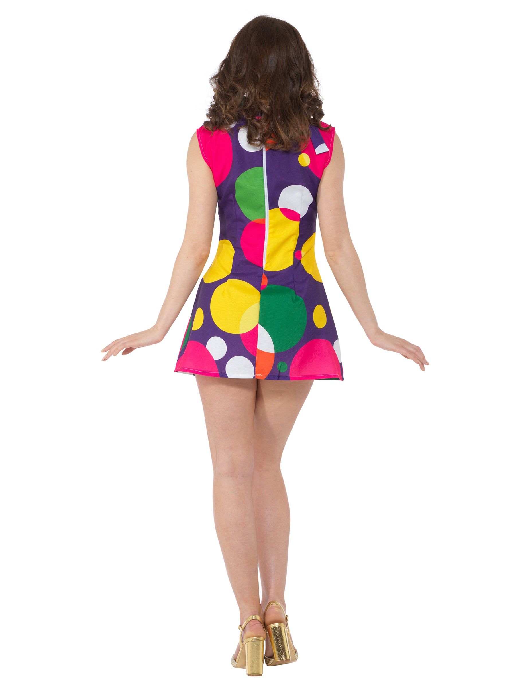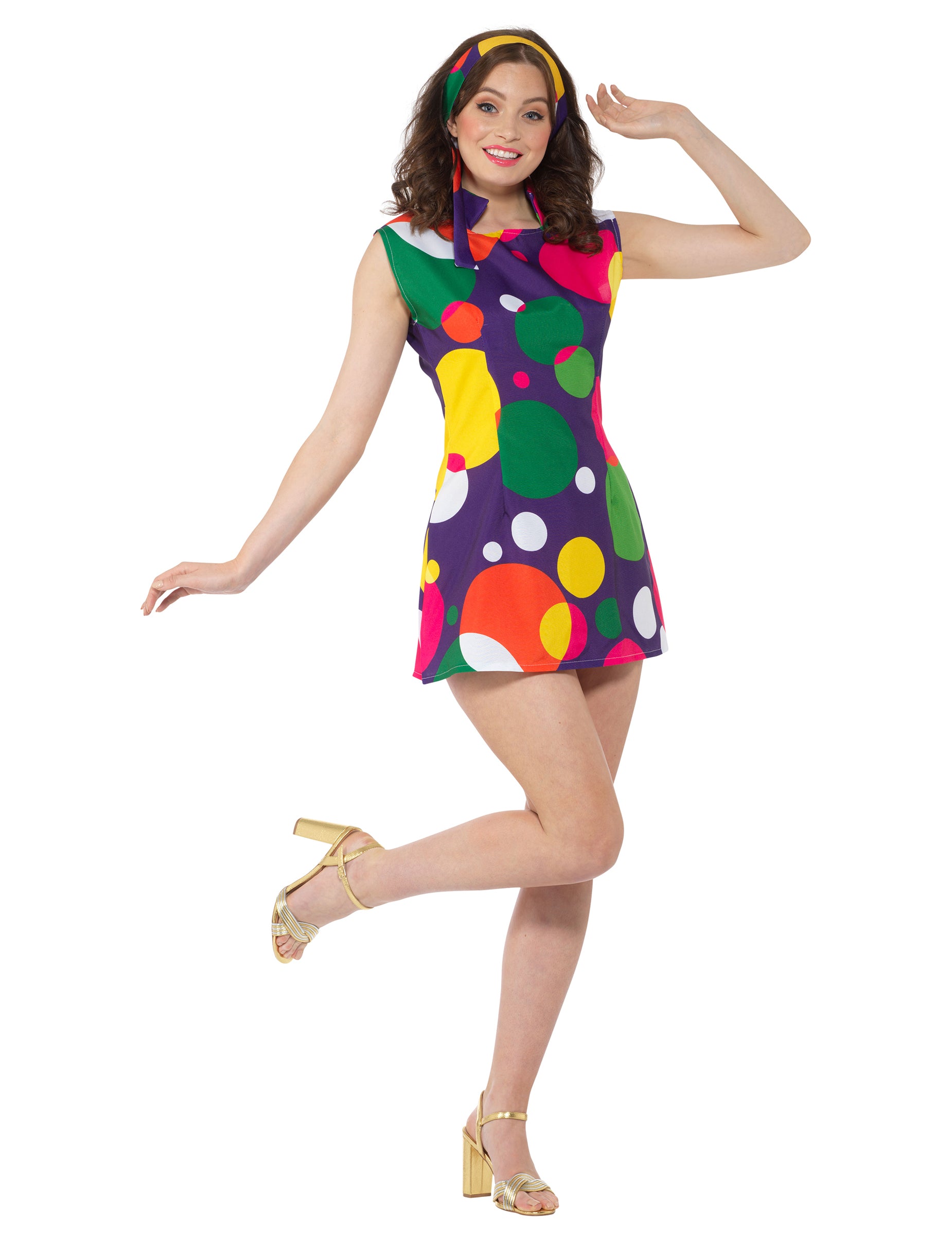 Ez a diszkó jelmez tartalmaz egy ruhát és egy fejpántot (a csizmát nem tartalmazza). Lila színű, a ruhát különböző színű és különböző méretű borsóval nyomtatják. Ujjatlan és gallérja van. Ugyanazon mintázatú fejpánt, mint a ruhát a hajba kell kötni. Ez a nők számára ez a pop együttes tökéletes lesz a barátokkal álcázott esti ruhaként!