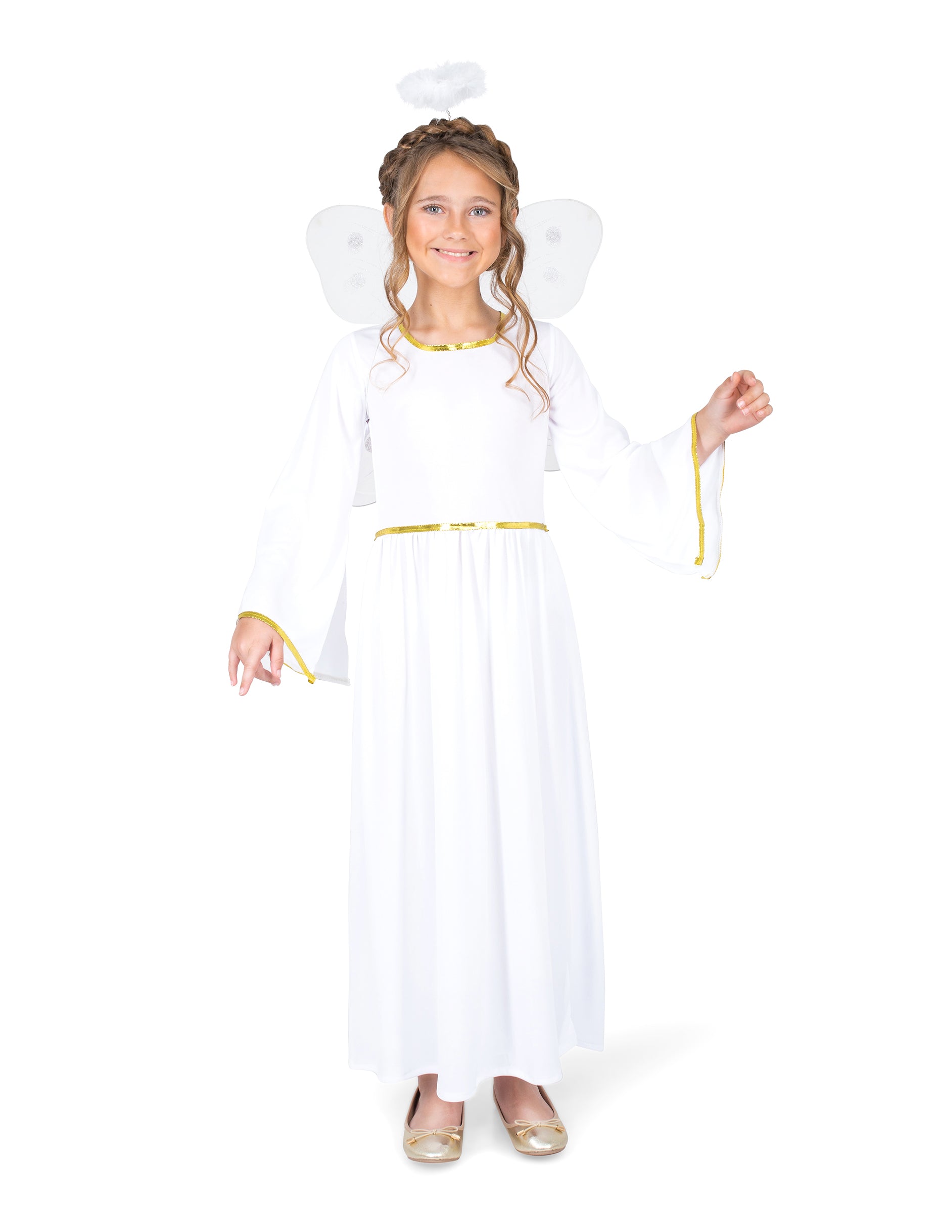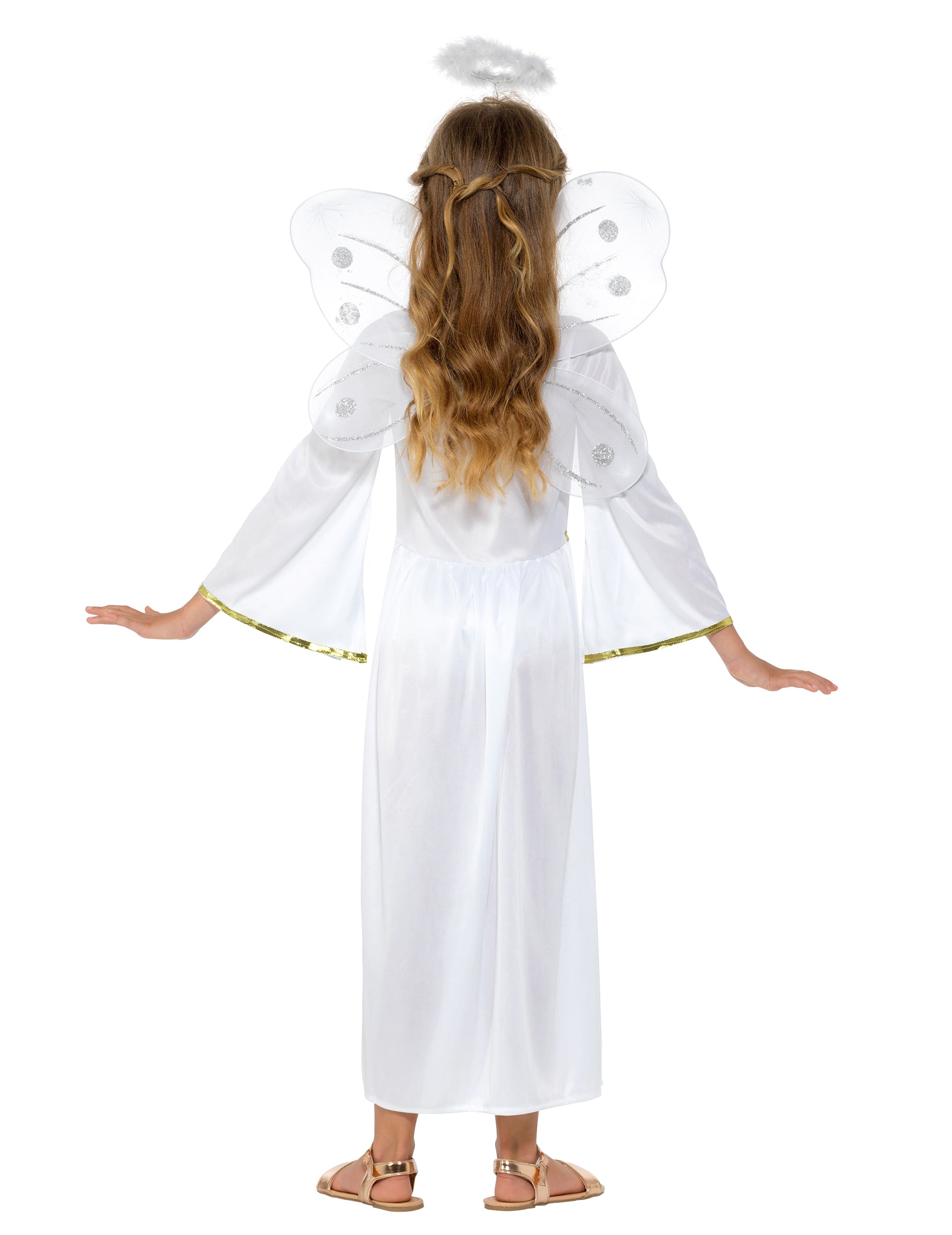 Ez az angyal jelmez ruhából, szárnyakból és fejpántból áll (a balerinák nem tartoznak). A hosszú ruha fehér, és magában foglalja a gallérral, derékkal és hüvelyekkel ellátott aranyozást. Az angyal szárnyak fehérek. Ami a fejpántot illeti, a szintetikus tollban nagyon fehér halo van. Ez a Girl számára készített készlet ideális lesz, hogy csodálatos kis angyal legyen a show vagy a karnevál idején!