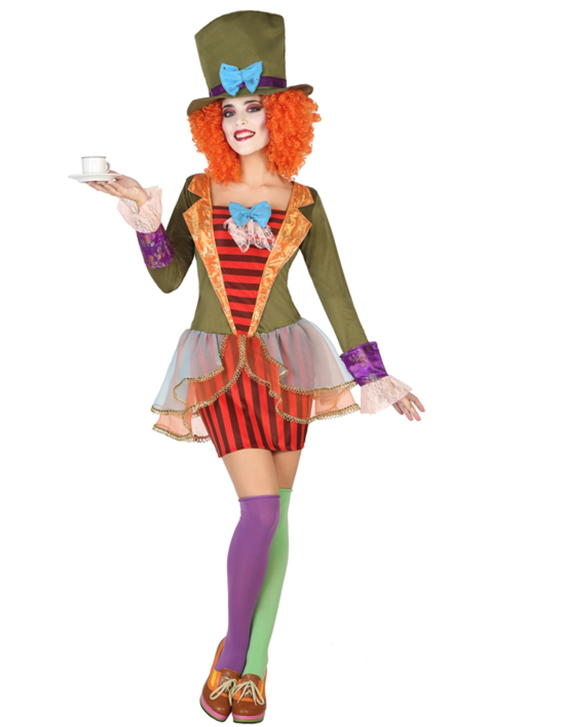 Ennek a kalapos nőknek szóló jelmeze tartalmaz egy ruhát és egy kalapot (alsó, parókát és cipőt, amely nem tartozik). A rövid ruhának hosszú ujja van. A ruha színe, narancssárga, arany virágmintákkal, kiterjed rajta. A ruha piros csíkos a mellszobor közepén. A tetején kék pontot és csillagcsomót és csipkét visel. A ruha elasztikus a hátsó részén. A ruha alja szintén piros csíkos. Narancssárga és kék vitorla -szerű anyaggal van bélelt, arany és többszínű szalaggal körülvéve. Az ujjak vége lila panelek vannak, virágnyomással és csipkével. A felső kalap khaki, lila szalaggal körülvéve. Kék pontot és csillagcsomót visel. Ez a folyó jelmez ideális a kivételes karnevál sikeres számára.
