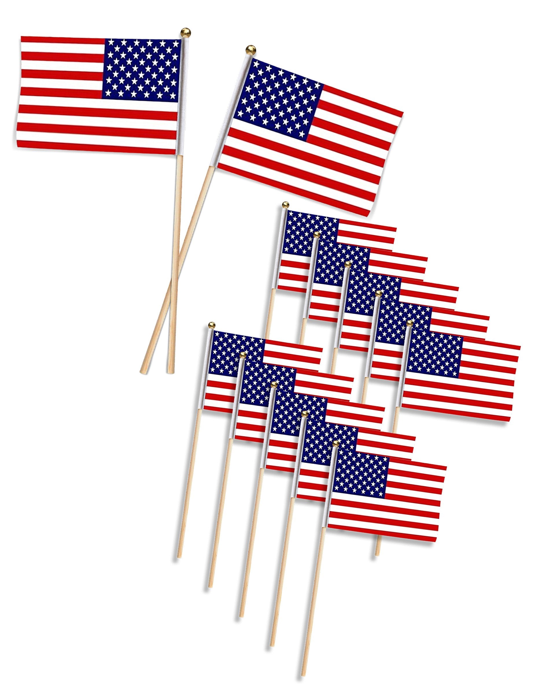 Ez a 12 DAP az Amerikai Egyesült Államok zászlóját képviseli. A zászlót ábrázoló szövet zászlók egy fa pálcára vannak felszerelve. Körülbelül 25 cm x 11,5 cm -t mérnek. Ez a 12 USA zászlóból álló tétel tökéletes lesz az Amerika témájú partiján!