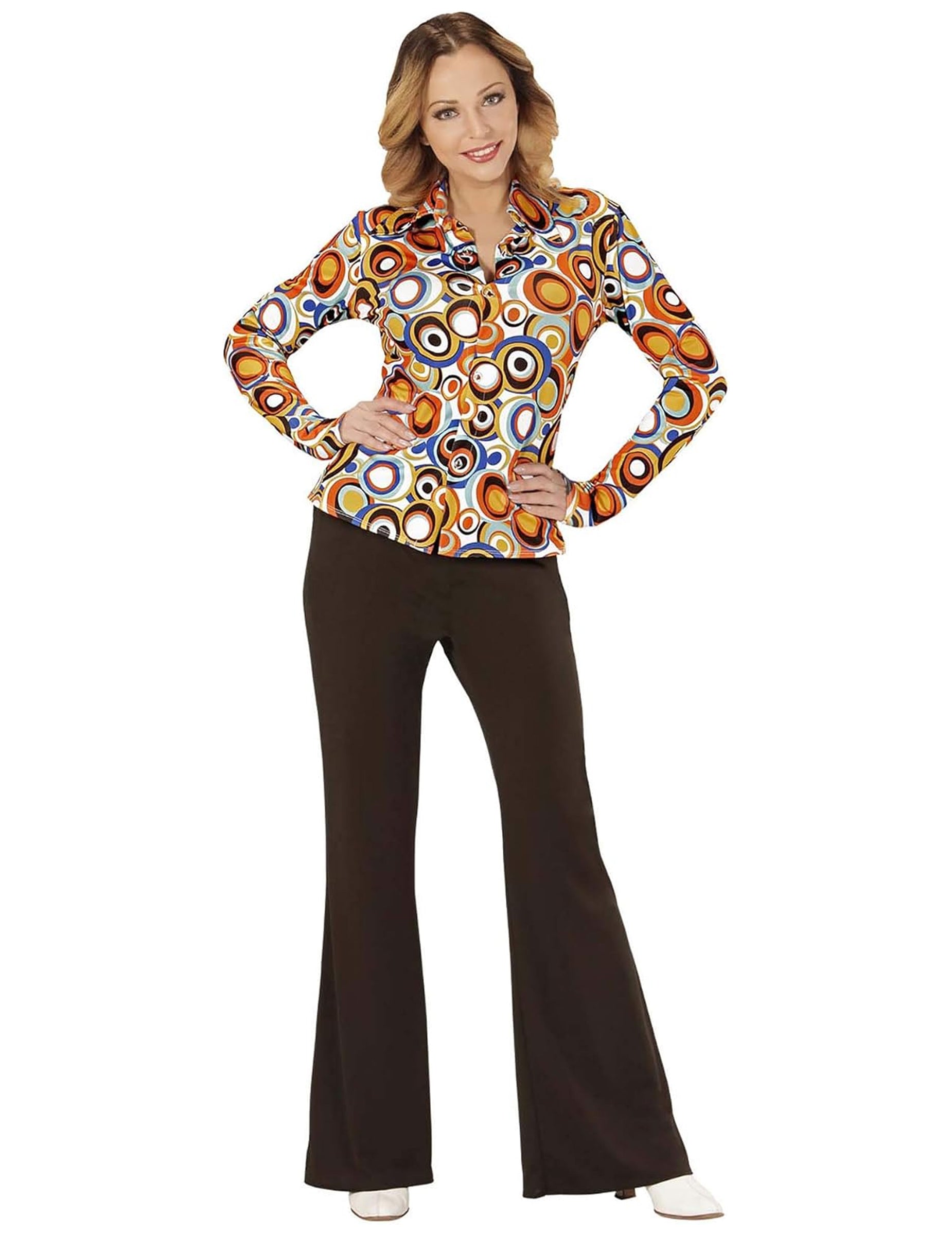 Ezt a Groovy nőknek szóló inget színes buborékmintákkal nyomtatják, lapát gallérral. A következő disco estére vagy a 70 -es évek témájú partira ez az ing tökéletes lesz! Copyright Widmann SRL