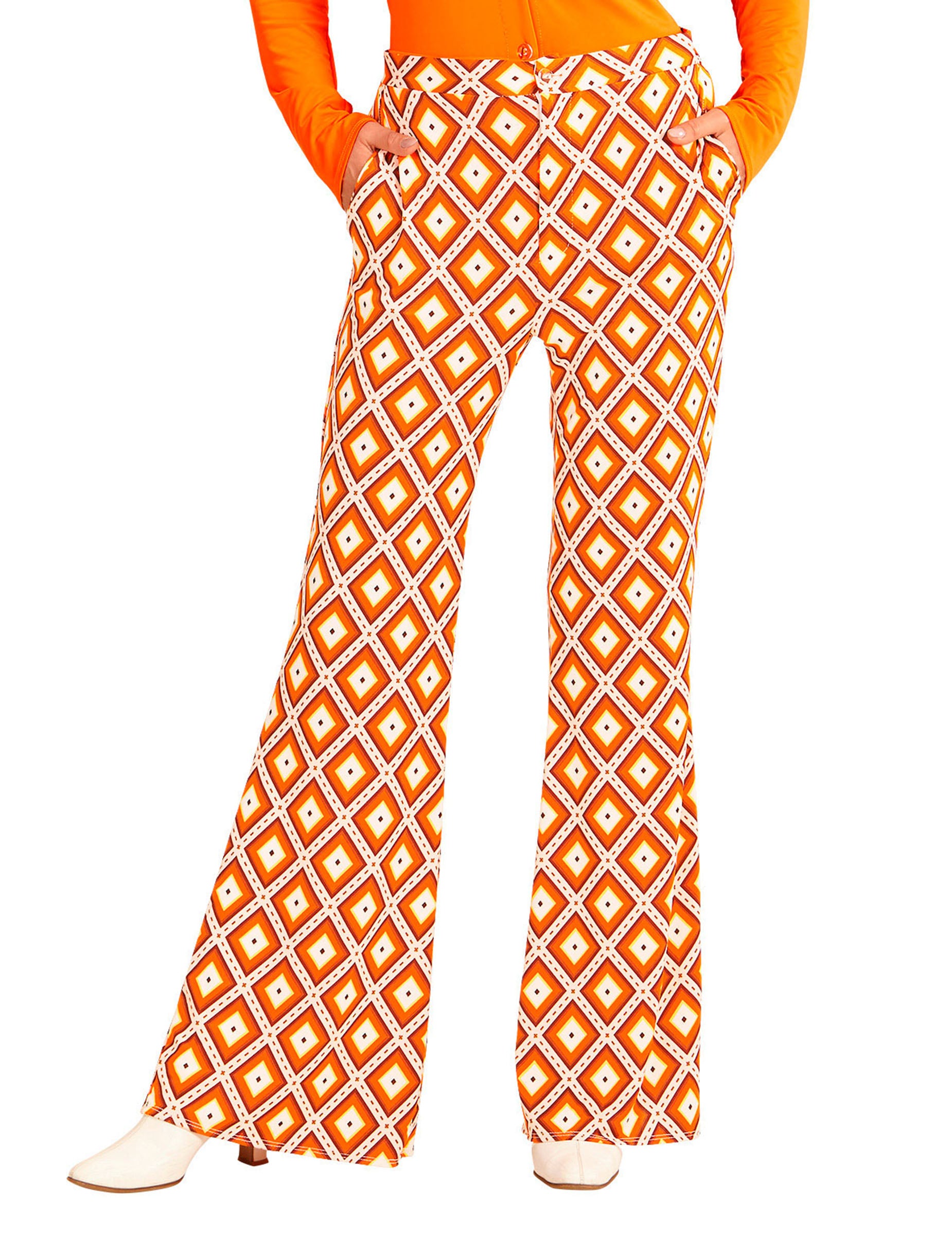Ez a női trapéznadrág a 70-es évekből narancssárga árnyalatokban készült, pszichedelikus rombusz mintákkal nyomott. A dereka gumírozott, hogy minél jobban illeszkedjen az alakodhoz, elöl pedig gombbal és cipzárral záródik.