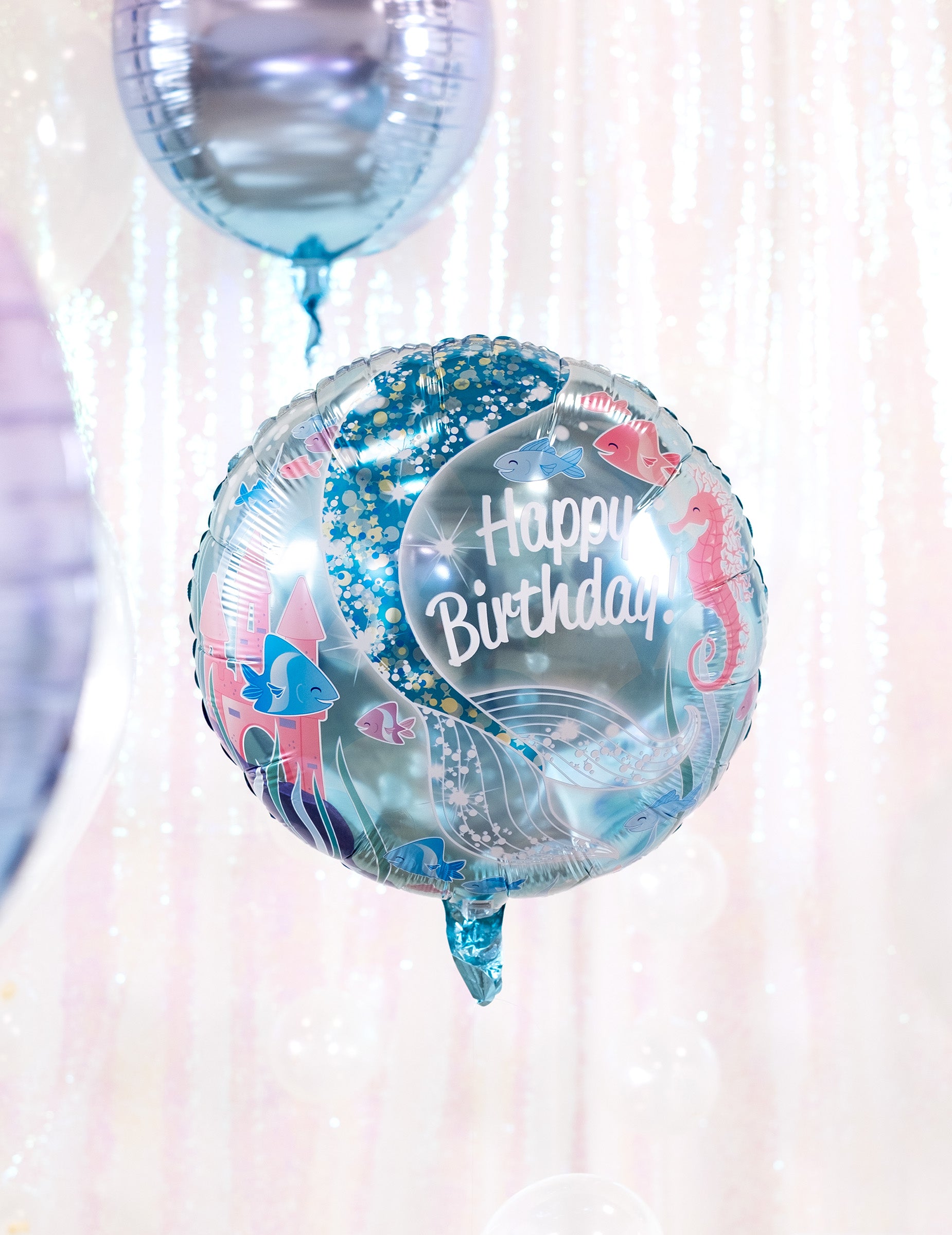 45,7-es mérettel cm, Ez alumínium lufi Egy csipetnyi varázslatot visz az eseményedbe. Könnyen felfújható héliummal vagy levegővel egy szívószál segítségével. A kék árnyalatú vízi illusztráció egy csóvát mutat. sziréna csillogó előtte egy rózsaszín kastély Varázslatos. Ez labda tökéletes az ünneplésreszületésnap egy kislányról, aki rajong érte sellők.