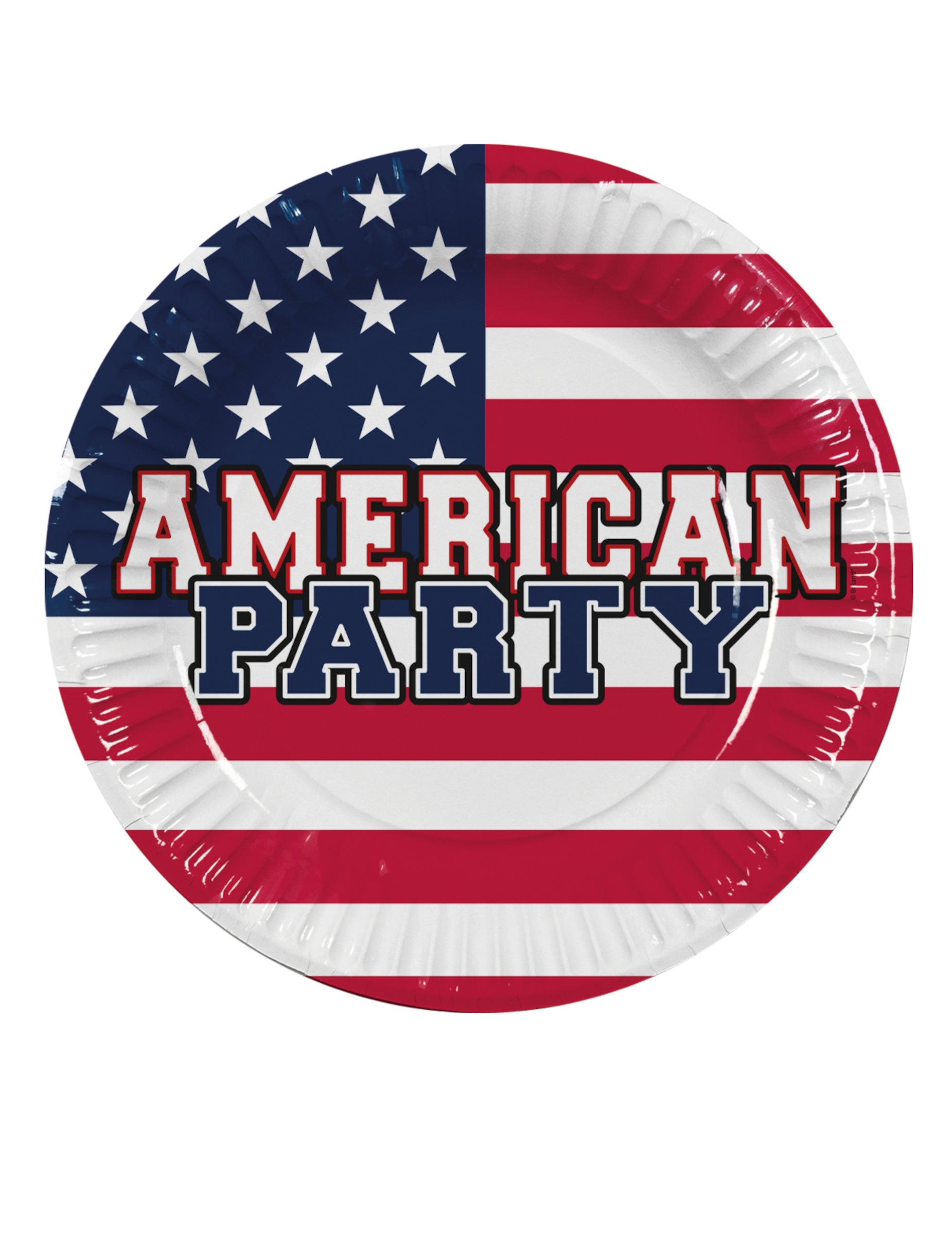 Ezeket a lemezeket 10 tételben adják el. Kartonból készülnek, és kb. 23 cm átmérőjűek. Az amerikai zászló és az írás: "American Party"! A lemezek kerek vagy négyzet alakúak lesznek, a modell véletlenszerűen érkezik. Ideális az asztal elkészítéséhez minden alkalommal, hogy bulizhasson az USA témájára!