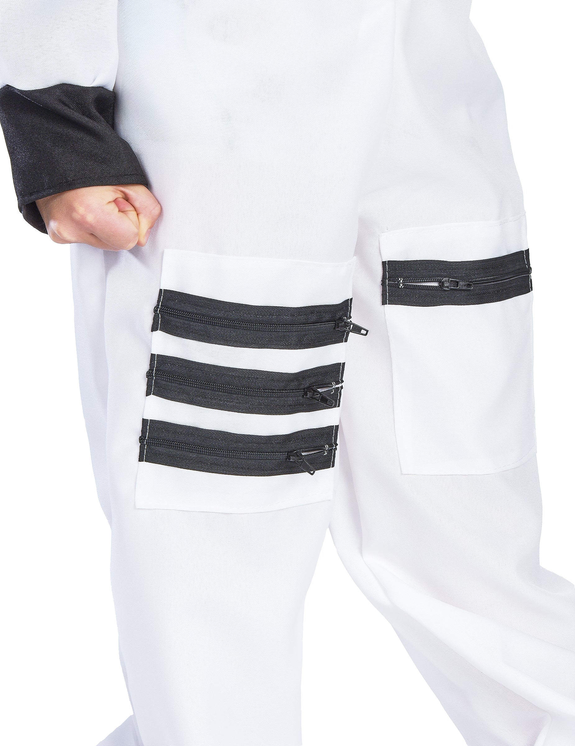 Ez a gyermek űrhajós jelmez egy fehér, hosszú, nem látott kombinációból áll, amelyet NASA jelvényekkel díszítenek a mellszoboron és az ujjakon. Hamis hevederek és egy fekete öv díszítik a ruházat tetejét, és nagy számú zseb van. A kombináció elülső oldalán cipzárral rendelkezik, amely lehetővé teszi gyermekének, hogy könnyen elhelyezze. Ezzel az űrhajós jelmezével gyermekének feje lesz a csillagok a karneváli napon.