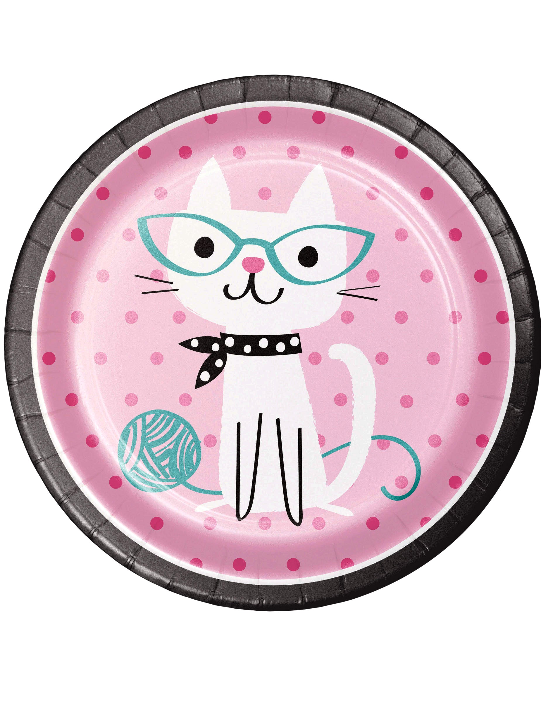 Dobj fel egy csipetnyi édességet a bulidba ezzel a 8 darabos csomaggal kartontányérok 22-ből cm. Rózsaszín pöttyös háttérrel és fekete szegéllyel ellátott tányérok mindegyike egy imádnivalót ábrázol. macska Stílusos fehér szemüveggel és pöttyös kendővel. Egy kis gombolyag fonal teszi teljessé ezt az aranyos jelenetet. Ezek eldobható tányérok ideálisak egy ünneplésre születésnap a macskák témájában, így örömet szerezve minden kis rajongónak macska.