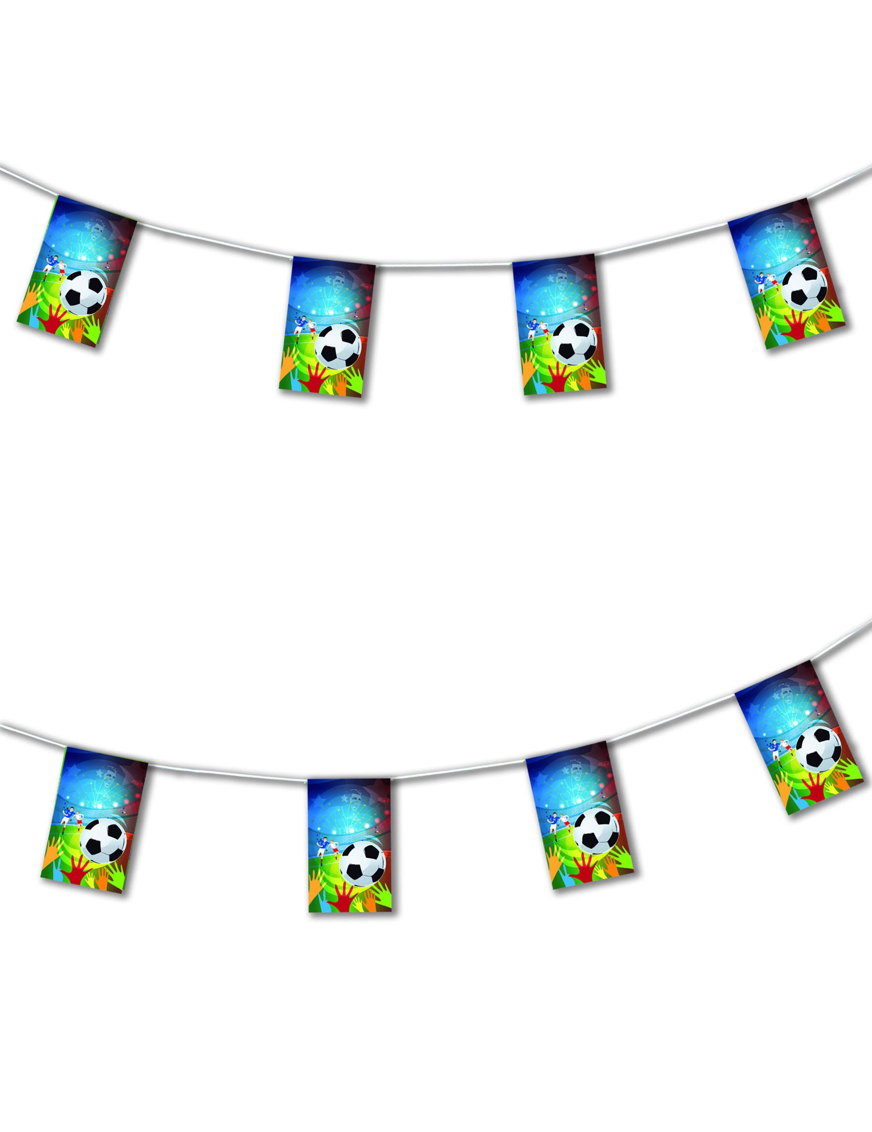 Ez a tűzálló papír koszorú körülbelül 4,5 m hosszú. Kis többszínű zászlókból áll, futballgolyó, támogatók és két labdarúgó nyomtatásával. Ez a Guriland tökéletes lesz a szoba díszítéséhez a világkupán vagy egy labdarúgó -estén a barátokkal!