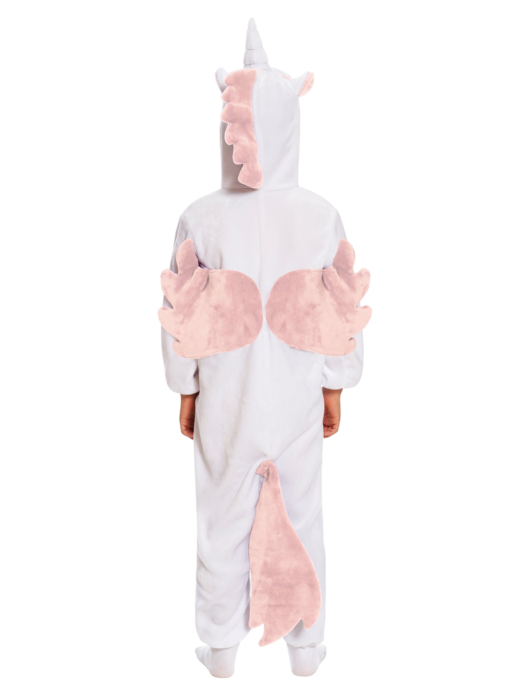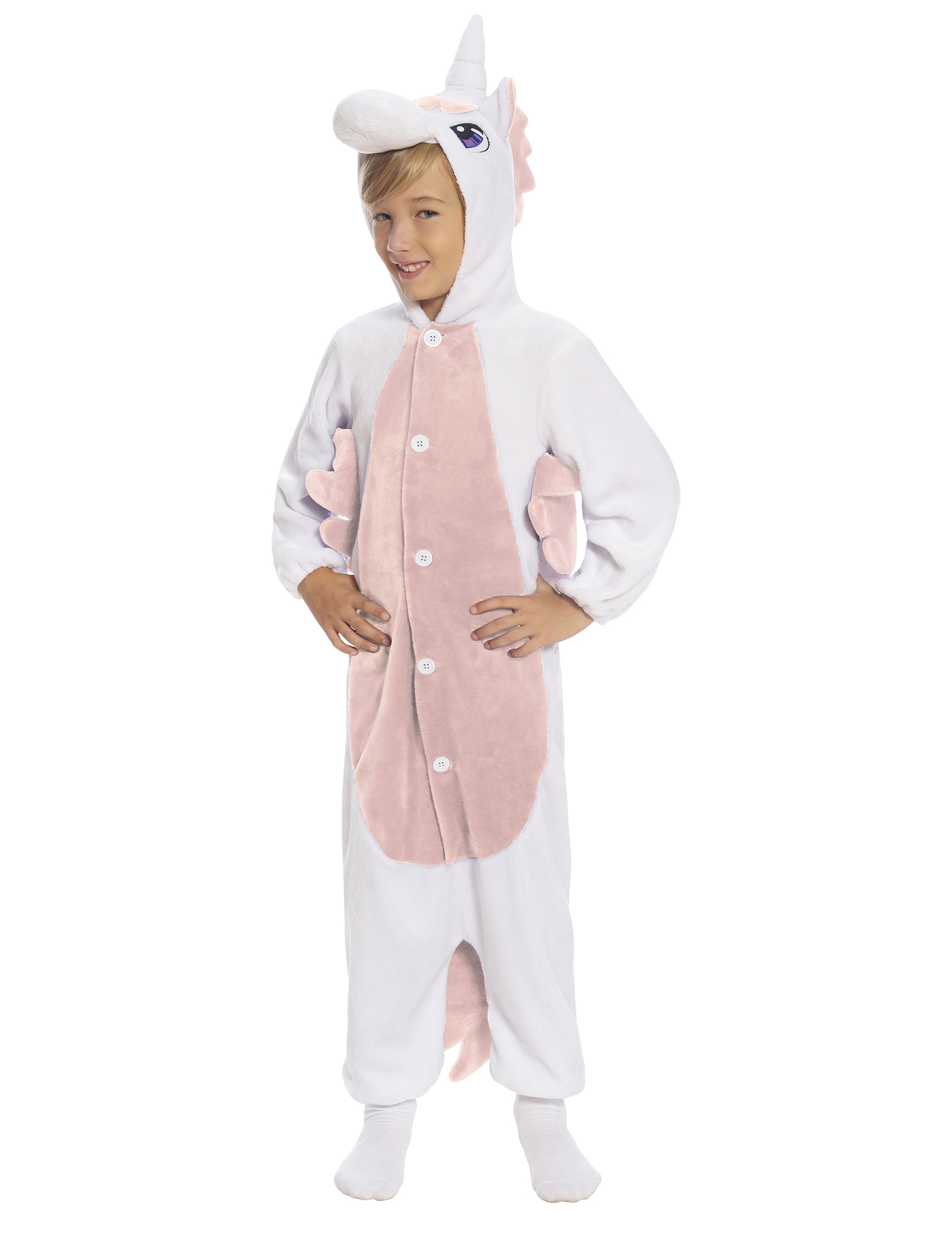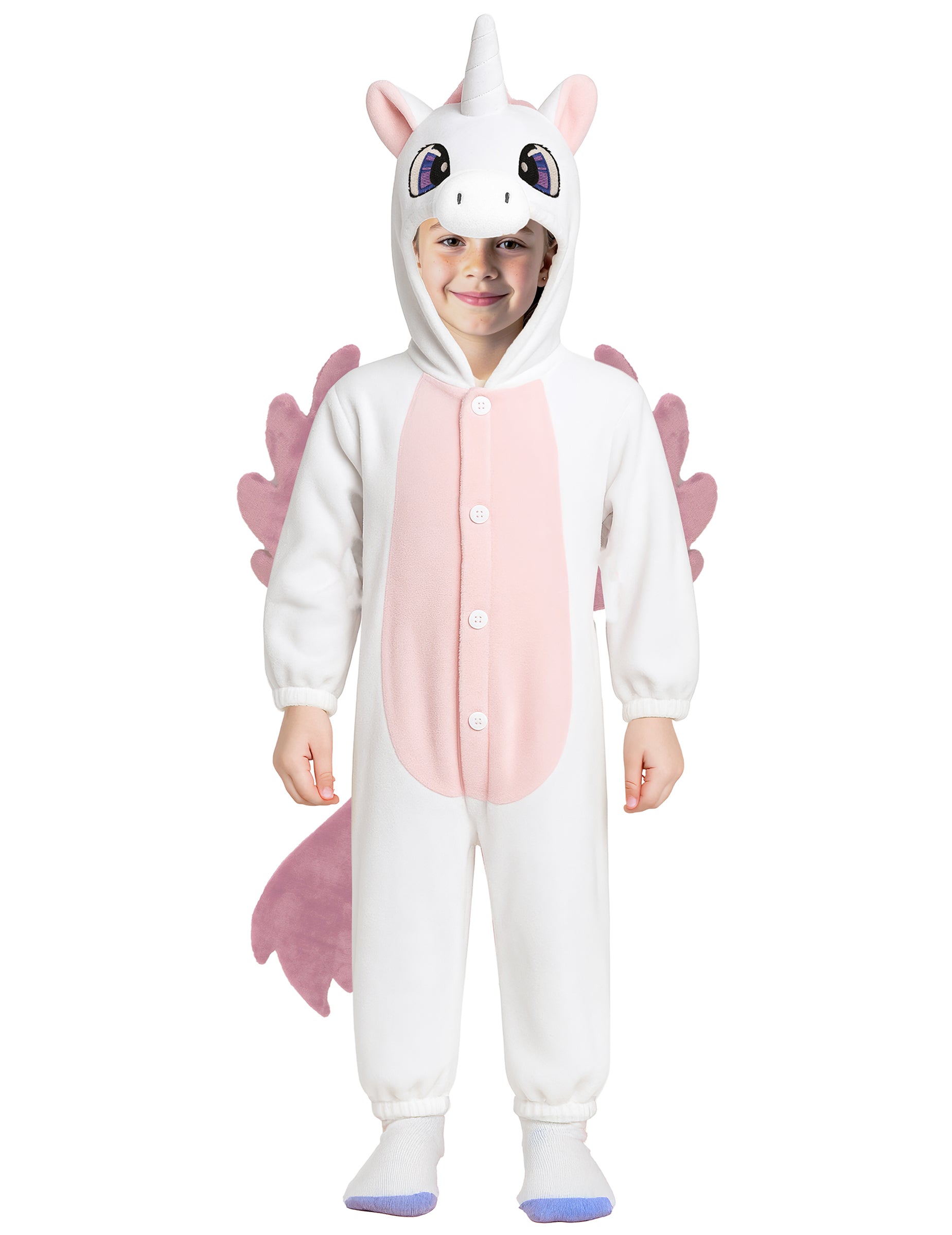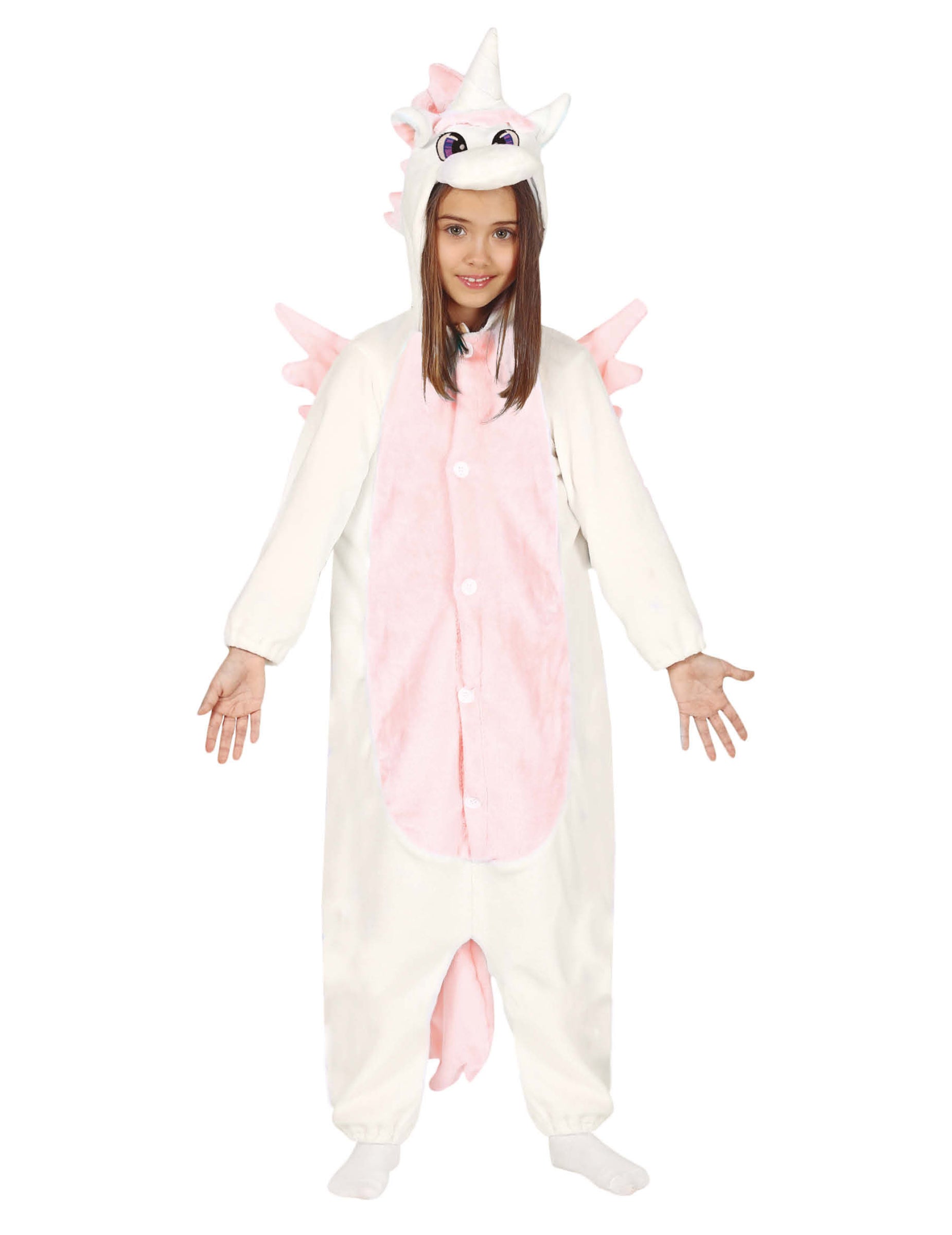 Ez a gyermek jelmez kombinációt tartalmaz. A kombináció fehér, rózsaszín hasa. Van egy motorháztetője, amely egy egyszarvú fejét képviseli, szép fehér kürttel és nagy kék szemmel. Egy rózsaszín farok és szárnyak díszítik a kombináció hátulját. Könnyen bezárul az elülső helyen elhelyezett gomboknak köszönhetően. Ideális lesz arra, hogy gyermekét egyszarvává alakítsák a karneválra!