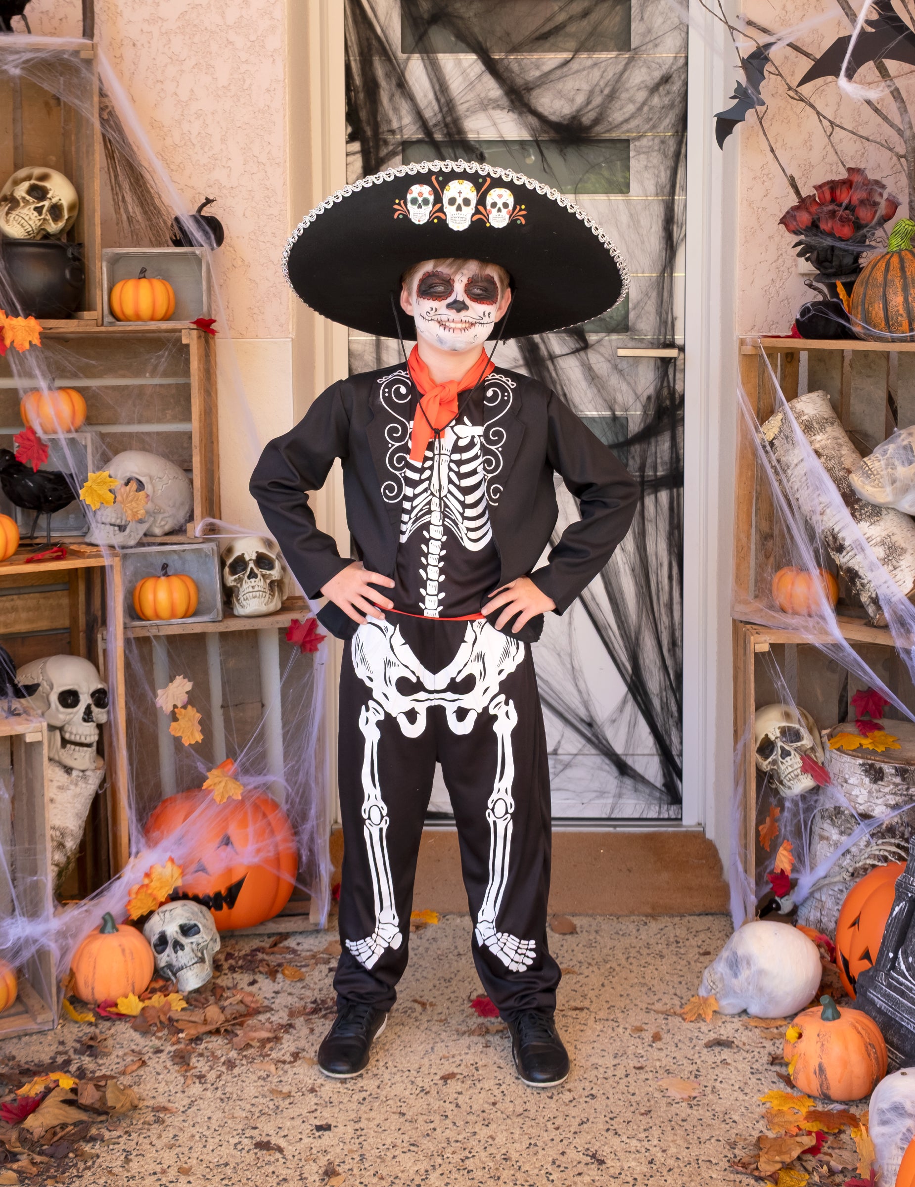 Ez a csontváz dia de los muertos csontváz jelmez egy bandanából, kombinációból, kabátból és övből áll. A fekete dzsekit elöl fehér nyomatok díszítik. A piros bandana illeszkedik az övhez, hogy a derékhoz kötözze. Válassza ki ezt a csontváz -váz jelmezét a Los Muertos -nak a fiú számára a Halloween számára.