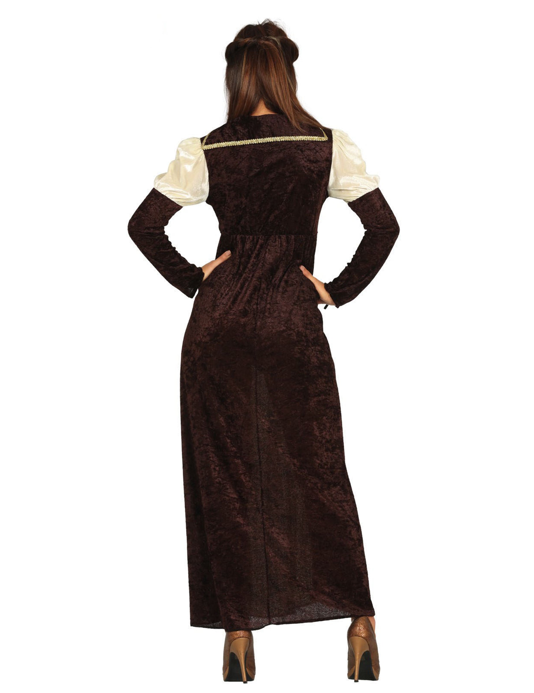 Ez a középkori hercegnő jelmez egy ruhából áll, amely a boka felé tart. A ruha elsősorban barna bársonyos effektusú szövetből áll. A hosszú ujjú puffadt a vállakkal, és bézs anyagból készül, amelyet a szoknya elején visszahívnak. Arany kötőanyagok befejezik ezt a pazar hercegnő ruhát (a koronát nem tartalmazza). Élvezze újra a középkor idejét, ha ezt a hercegnő jelmezt egy középkori rendezvényre vagy egy álruhás estére helyezi.